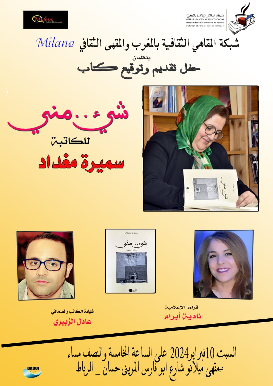 في إطار أنشطتها الإشعاعية للموسم الثقافي الحالي، تنظم شبكة المقاهي الثقافية بالمغرب ، حفل تقديم وتوقيع كتاب “شيء .. مني ” للكاتبة والصحفية سميرة مغداد، بمشاركة الإعلامية نادية أبرام في قراءة للكتاب، والكاتب والصحفي عادل الزبيري في شهادة في حق المحتفى بها.