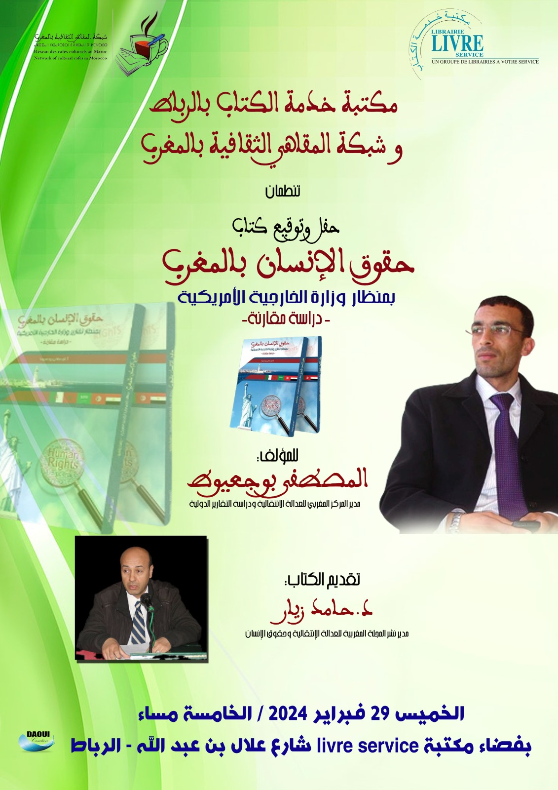 أعلنت شبكة المقاهي الثقافية بالمغرب عن تنظيم حفل توقيع كتاب “حقوق الإنسان بالمغرب بمنظار وزارة الخارجية الأمريكية” – دراسة مقارنة – للمؤلف اامصطفى بوجعيوط، مدير المركز المغربي للعدالة الإنتقالية ودراسة التقارير الدولية، بتنسيق مع مكتبة خدمة الكتاب، يوم الخميس 29 فبراير 2024 على الساعة الخامسة مساء بفضاء مكتبة livre service شارع علال بن عبدالله بالرباط، وذلك في إطار استمرار أنشطتها الإشعاعية.