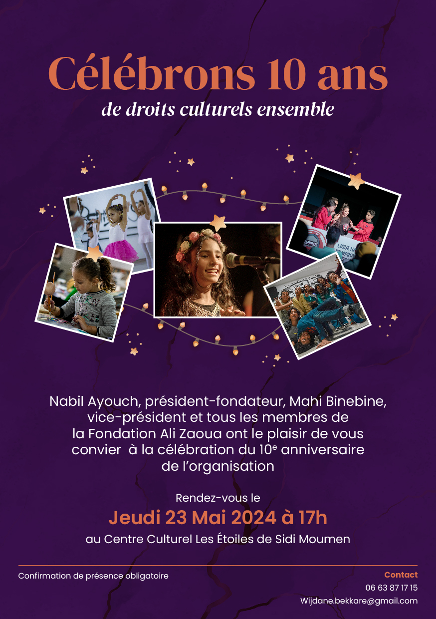 أعلنت مؤسسة علي زاوا عن احتفالها بالذكرى العاشرة لتأسيسها من خلال حفل سيسلط الضوء على مراكزها الستة في جميع أنحاء البلاد من خلال برنامج فني مميز. من المقرر تنظيم هذه الفعالية في 23 ماي 2024 بالمركز الثقافي نجوم سيدي مومن، حيث ستكون أمسية ترفيهية استثنائية تحتفي بالتنوع الثقافي والفني بحضور نخبة من الفنانين والمختصين في المجال الثقافي.
