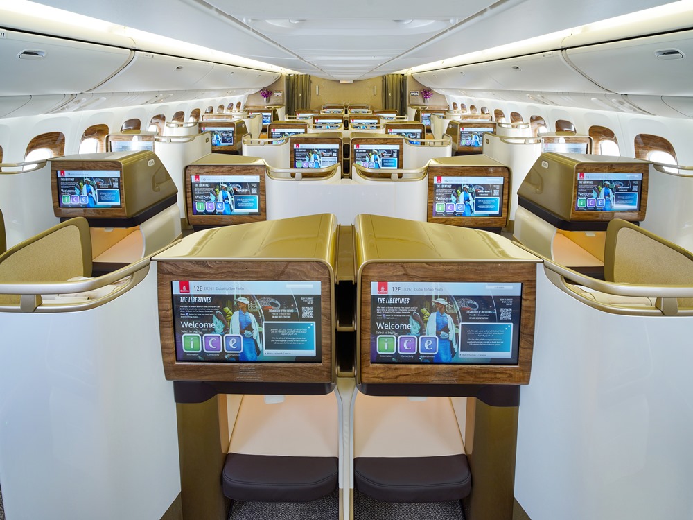وأورد البلاغ أنه تم، أيضا، تزويد كل مقعد بميني بار شخصي، وطاولة لتناول الطعام أو العمل، ومنافذ شحن متعددة للأجهزة الشخصية وغيرها، إلى جانب شاشات شخصية عالية الوضوح تعمل باللمس، يبلغ مقاسها 23 بوصة. كما تتضمن مقصورة درجة الأعمال في طائرة بوينج 777 التابعة لطيران الإمارات أيضاً صالة صغيرة للمسافرين يتم فيها تقديم الوجبات الخفيفة والمرطبات للمسافرين أثناء الرحلة.