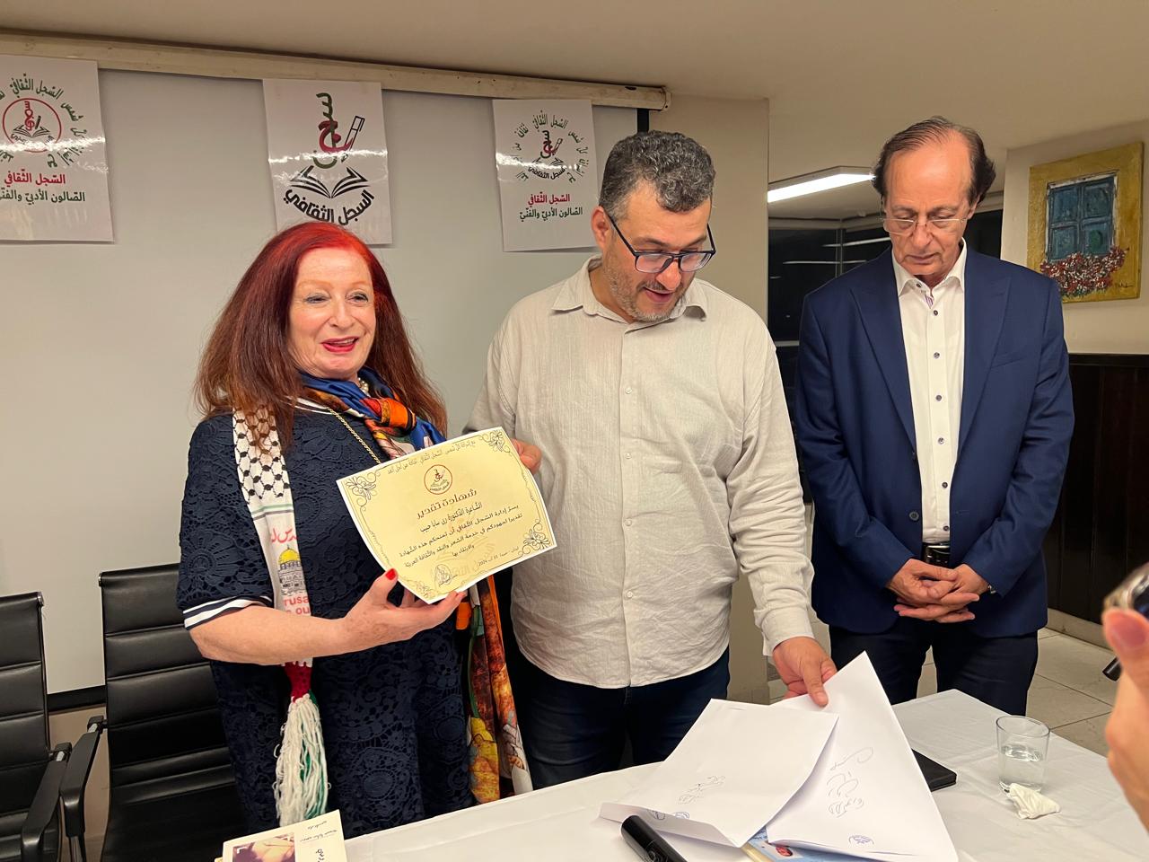 في الختام كُرم الضيفان بشهادتي تقدير ووشاحين فلسطينيين وأخذت الصور التذكارية لهذا المقهى الثقافي ، الذي نقلته الإعلامية إكمال سيف الدين عبر تقنية البث المباشر على صفحة حبر ولون .