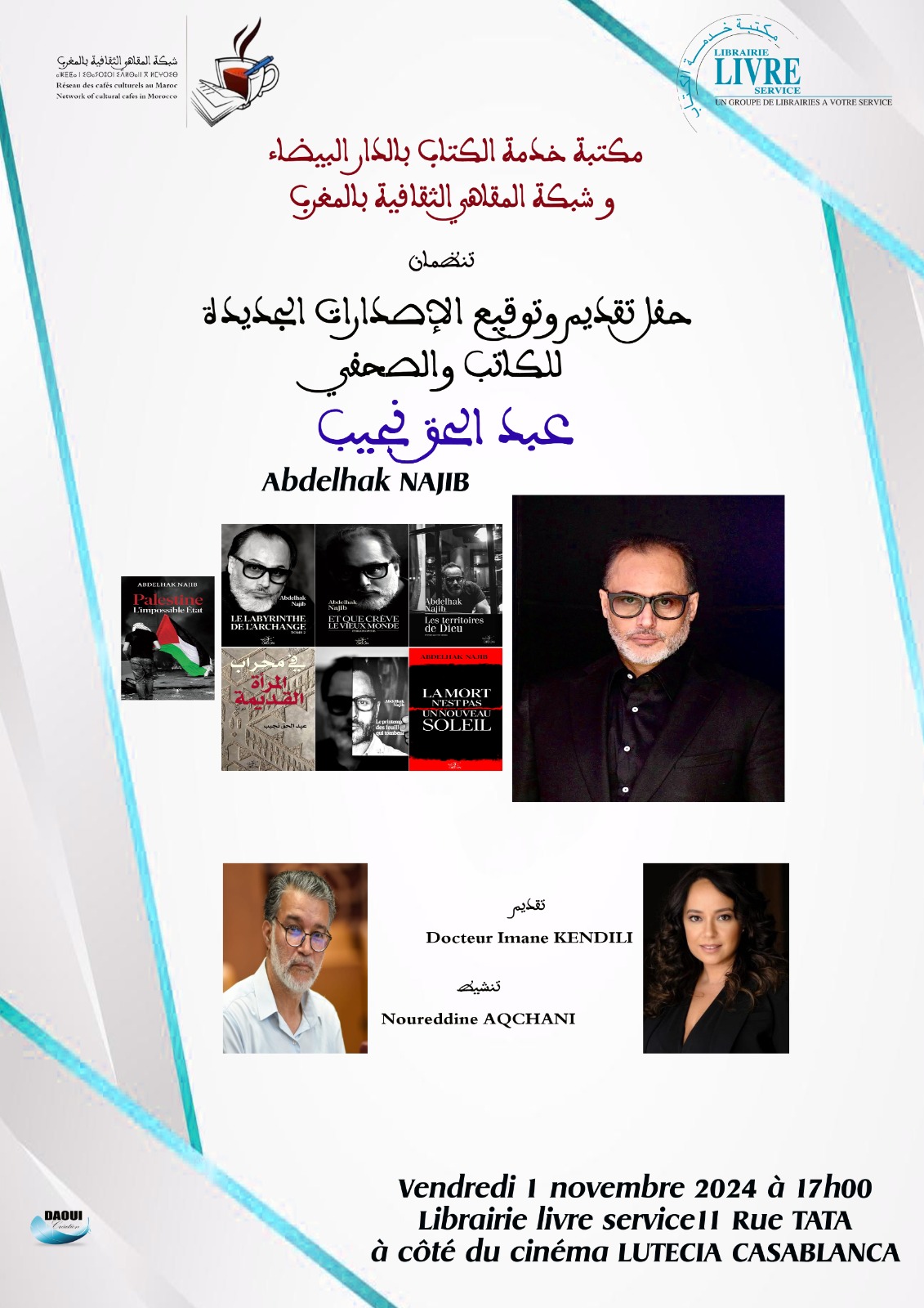 حفل تقديم وتوقيع الإصدارات الجديدة للكاتب والصحفي عبدالحق نجيب بمكتبة livre service زنقة طاطا بجوار سينما ليتسيا بالدار البيضاء على الساعة الخامسة مساء.