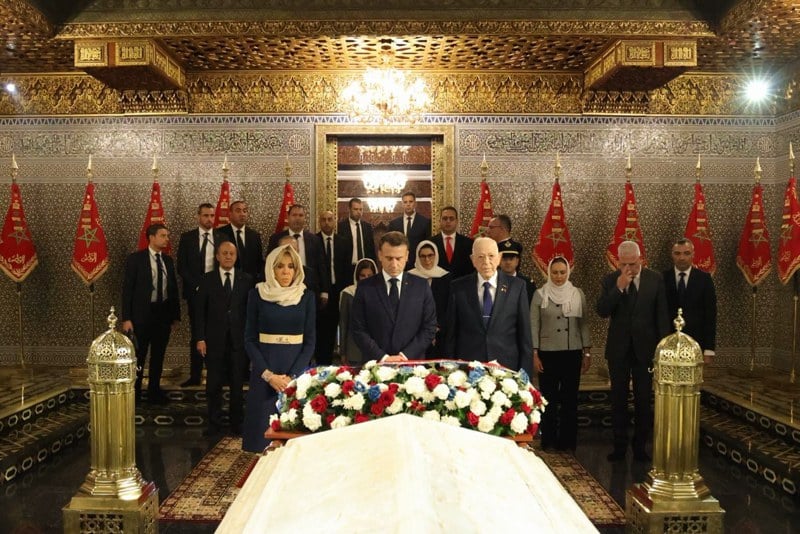 إثر ذلك، وقع السيد إيمانويل ماكرون، وحرمه السيدة بريجيت ماكرون، في الدفتر الذهبي للضريح. ثم تسلم الرئيس الفرنسي كتابا عن تاريخ الضريح ودرع ضريح محمد الخامس.