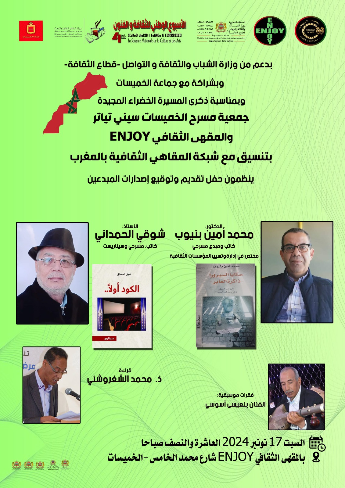بتنسيق مع شبكة المقاهي الثقافية بالمغرب، أعلنت جمعية مسرح الخميسات سيني تياتر والمقهى الثقافي Enjoy عن تنظيم حفل تقديم وتوقيع إصدارات المبدعين الدكتور محمد أمين بنيوب ” حكايا السيرورا ذاكرة العابر ” و الكود أولا ” للكاتب والسيناريست شوقي الحمداني.