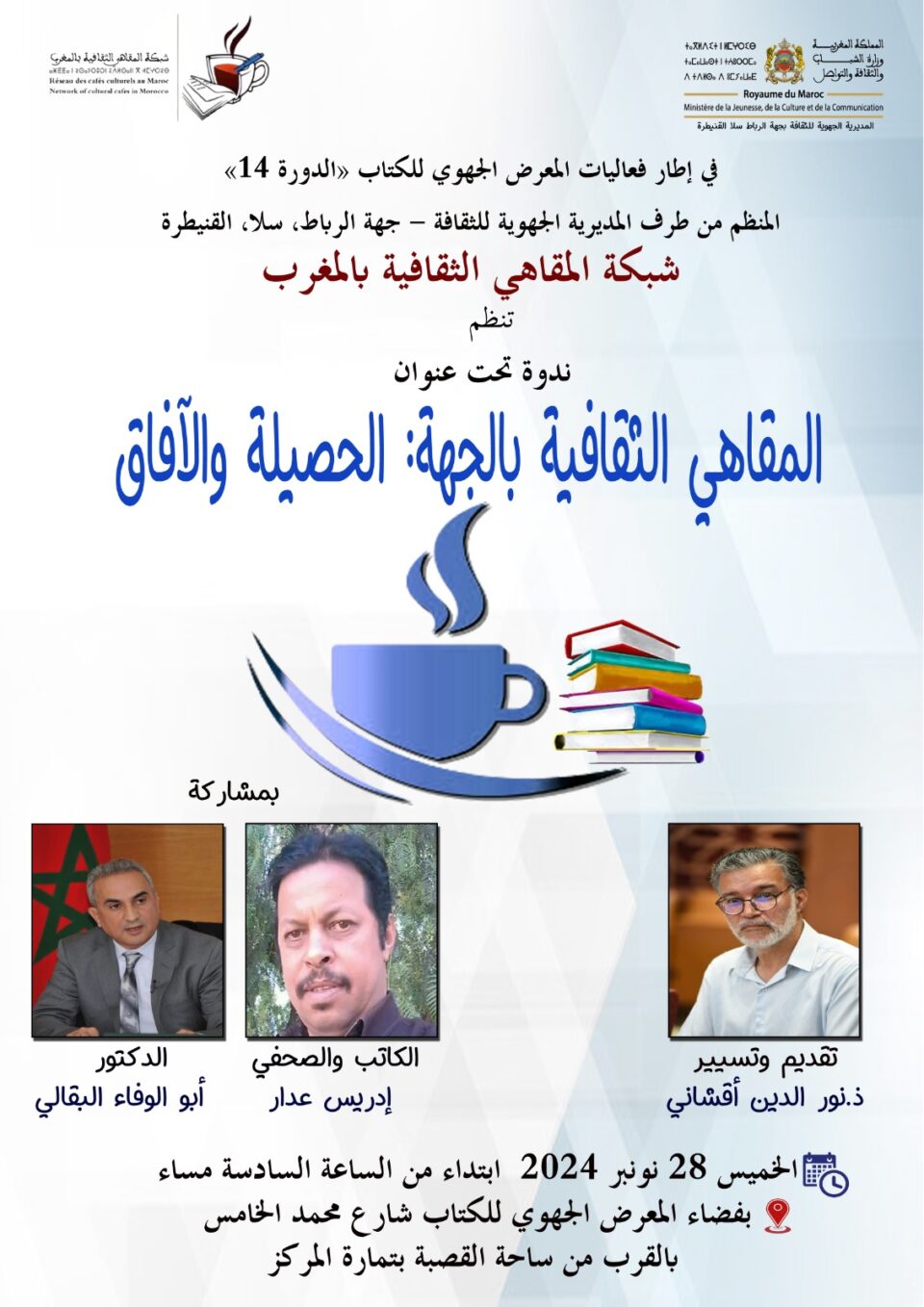 أعلنت شبكة المقاهي الثقافية بالمغرب عن تنظيم نشاطين ثقافيين، وذلك في إطار فعاليات المعرض الجهوي للكتاب في نسخته 14، المنظم من طرف المديرية الجهوية لقطاع الثقافة لجهة الرباط سلا القنيطرة.