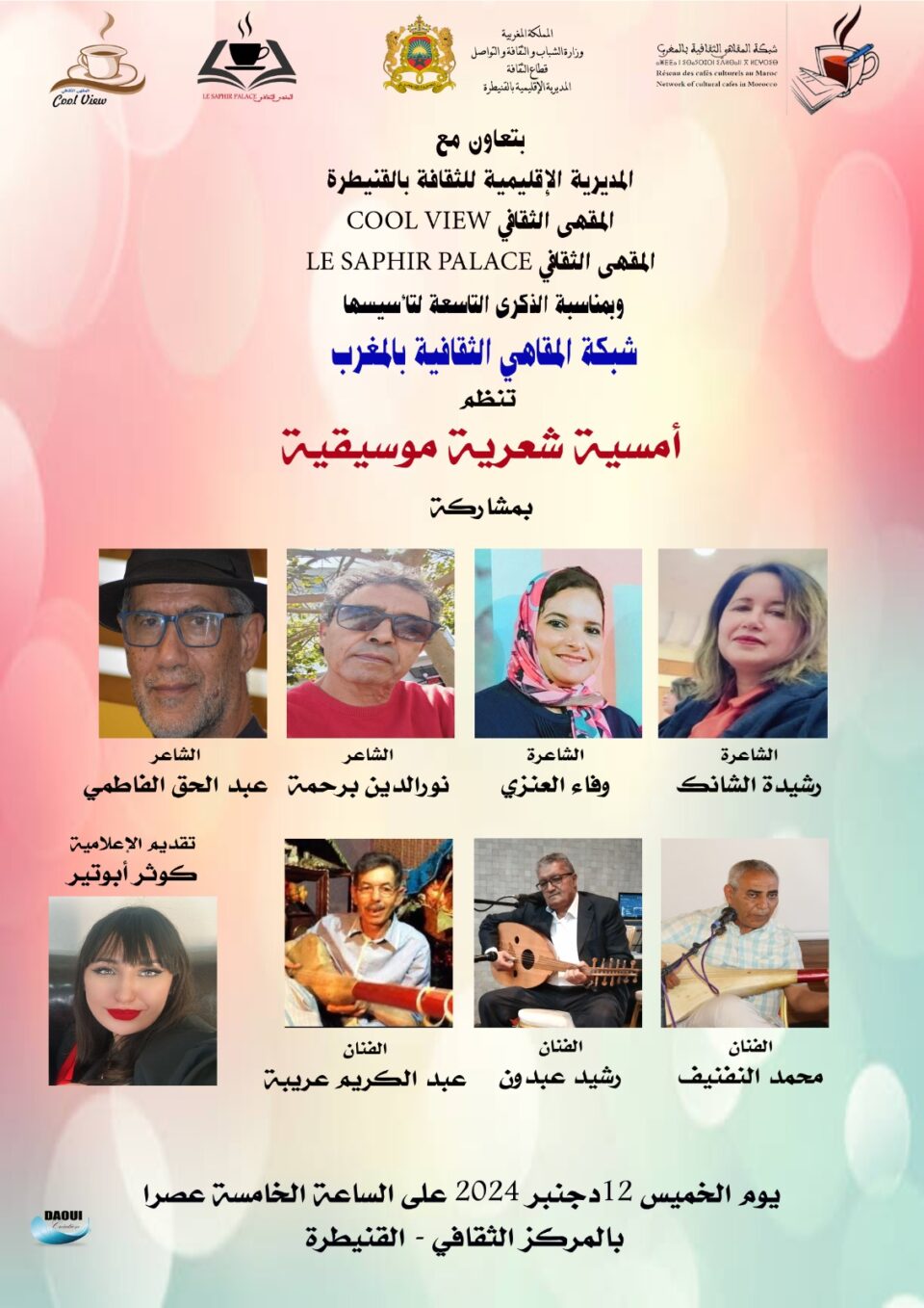 بمناسبة الذكرى التاسعة لتأسيسها (2015-2024)، تنظم شبكة المقاهي الثقافية بالمغرب أمسية شعرية موسيقية مميزة، وذلك يوم الخميس 12 ديسمبر 2024 على الساعة الخامسة مساءً بالمركز الثقافي بمدينة القنيطرة.