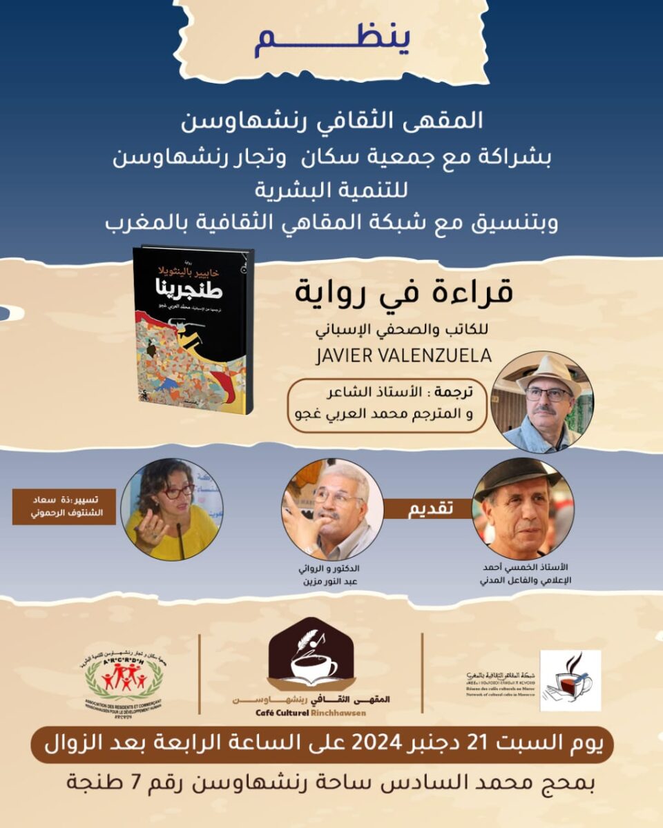 يستضيف المقهى الثقافي “رنشهاوسن”، بشراكة مع جمعية سكان وتجار رنشهاوسن للتنمية البشرية، وبتنسيق مع شبكة المقاهي الثقافية بالمغرب، جلسة قراءة ومناقشة لرواية “طنجرينا” للكاتب والصحفي الإسباني Javier Valenzuela، بترجمة الشاعر محمد العربي غجو.