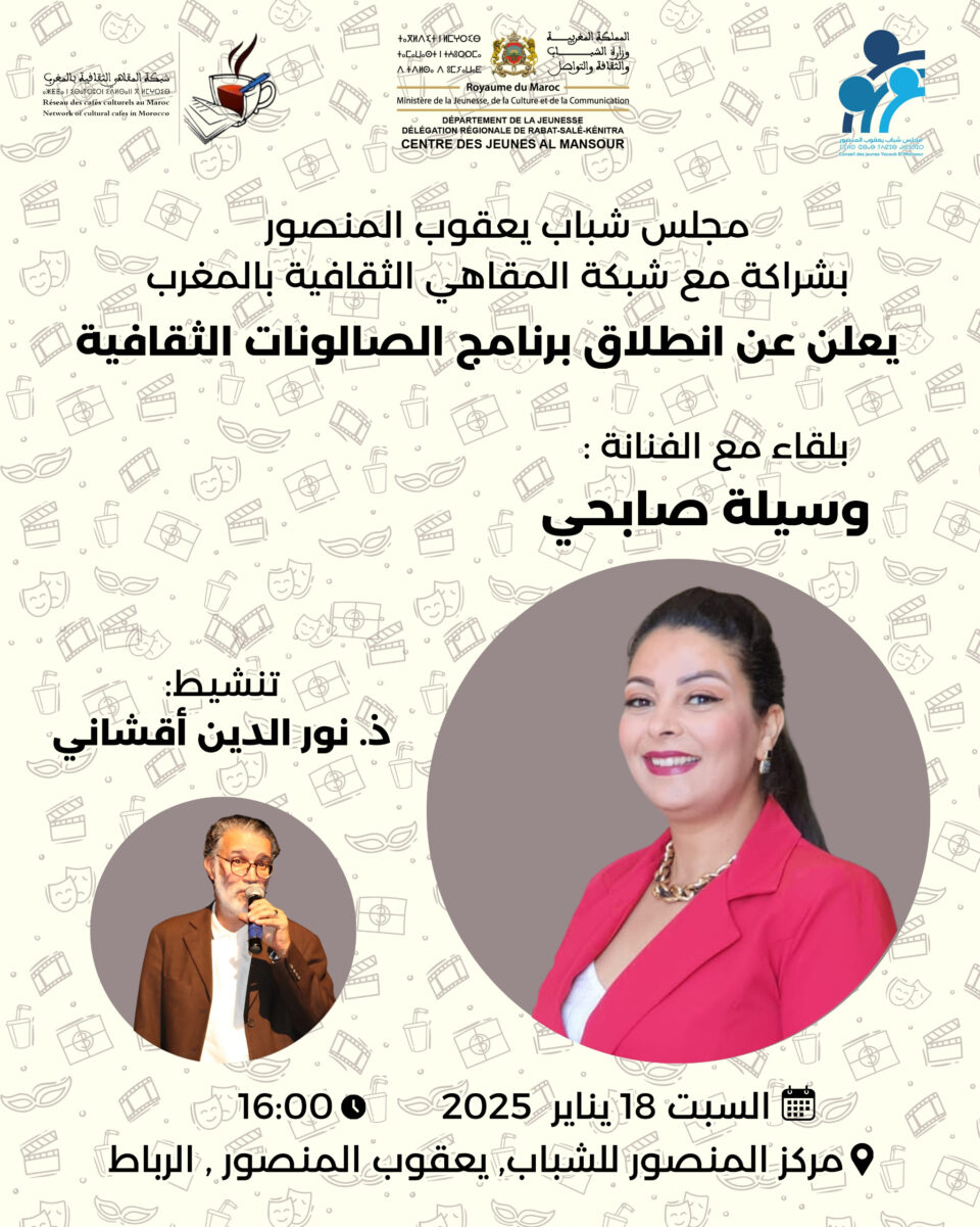 يستعد مجلس شباب يعقوب المنصور بالتعاون مع شبكة المقاهي الثقافية بالمغرب لإطلاق الصالون الثقافي الأول بحي يعقوب المنصور، وذلك يوم السبت 18 يناير 2025، ابتداءً من الساعة الرابعة عصرًا، بمركز المنصور للشباب بمدينة الرباط.