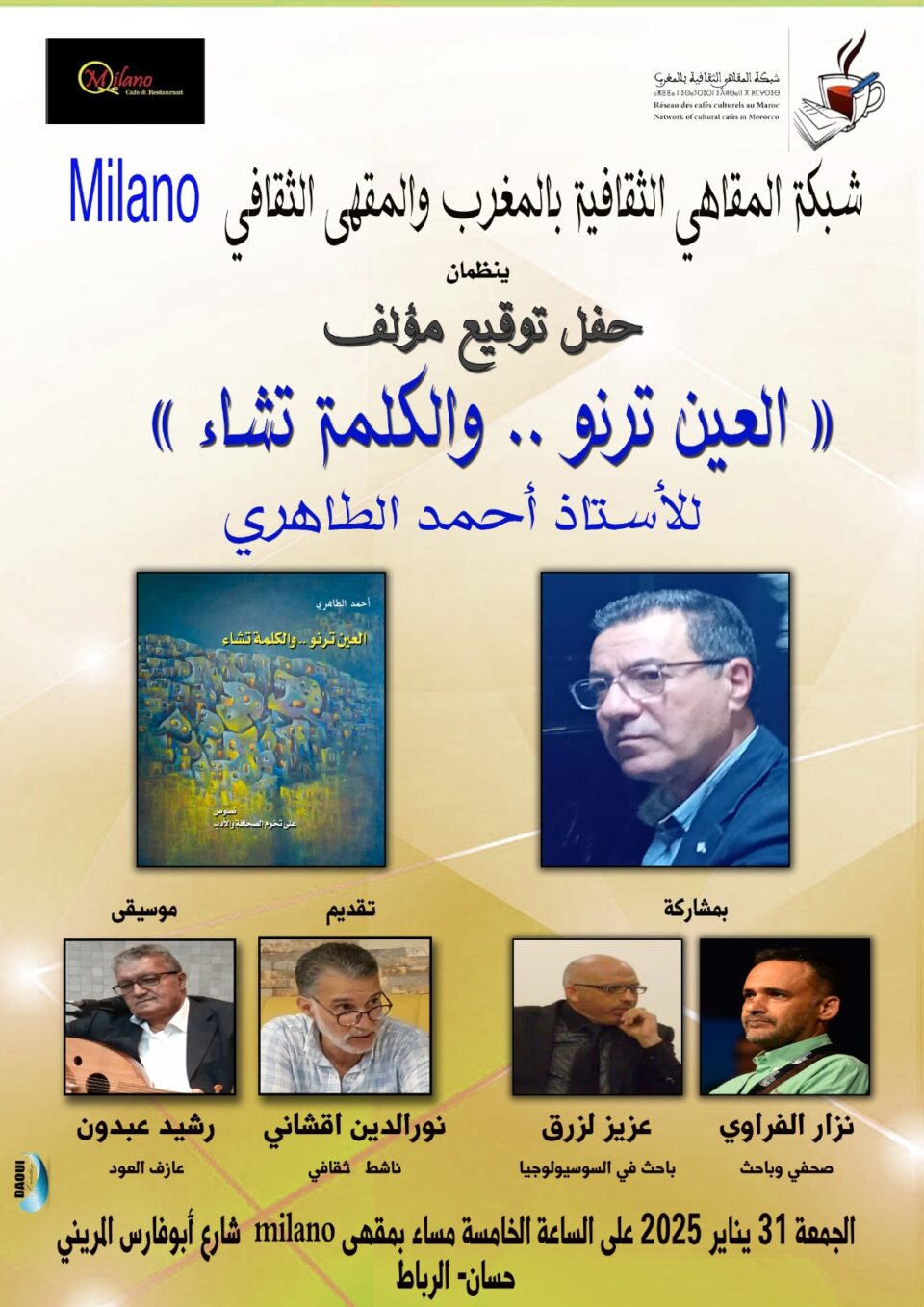 في إطار أنشطتها الثقافية لسنة 2025، تستضيف شبكة المقاهي الثقافية بالمغرب والمقهى الثقافي ميلانو بالرباط، حفل توقيع المؤلف الجديد للصحفي أحمد الطاهري بعنوان “العين ترنو.. والكلمة تشاء”، وذلك يوم الجمعة 31 يناير 2025 على الساعة الخامسة مساءً، بأحد المقاهي الثقافية بالرباط.