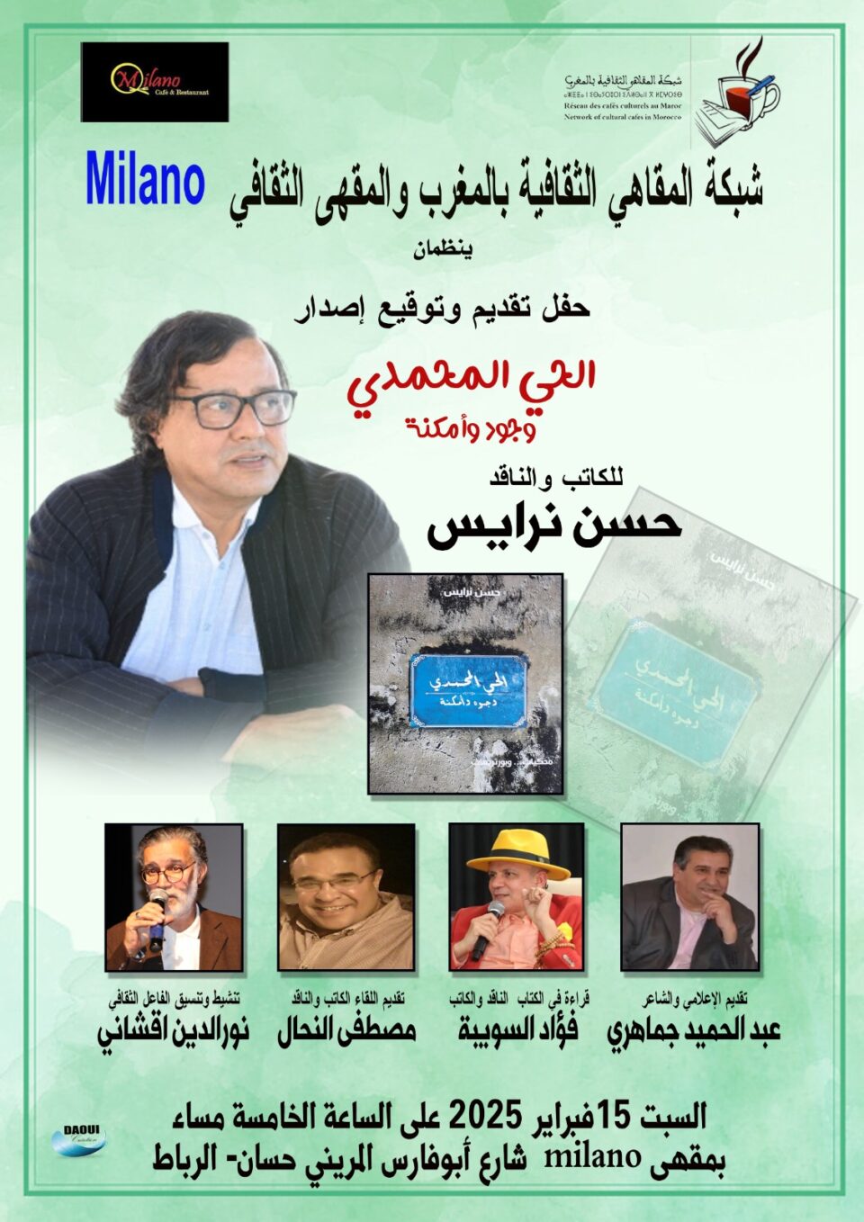 من جهة أخرى، يستضيف مقهى “ميلانو” بحي حسان في العاصمة الرباط، يوم السبت 15 فبراير 2025، حفل تقديم وتوقيع كتاب “الحي المحمدي وجوه وأمكنة” للكاتب والناقد حسن نرايس. يبدأ الحفل في الساعة الخامسة مساءً، بمشاركة إعلامي والشاعر عبد الحميد جماهري، والناقد والكاتب فؤاد السويبة، والكاتب مصطفى النحال. كما سيقوم الفاعل الثقافي نورالدين أقشاني بتنسيق فقرات اللقاء، الذي سيشرف عليه السيد عزيز كوغري.