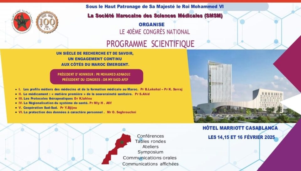 تحت الرعاية السامية لصاحب الجلالة الملك محمد السادس، تحتفل الجمعية المغربية للعلوم الطبية بمرور 100 عام على تأسيسها، بتنظيم مؤتمر علمي دولي خلال الفترة الممتدة من 14 إلى 16 فبراير 2025 في مدينة الدار البيضاء، بحضور نخبة من الفاعلين الصحيين والخبراء في المجال الطبي.