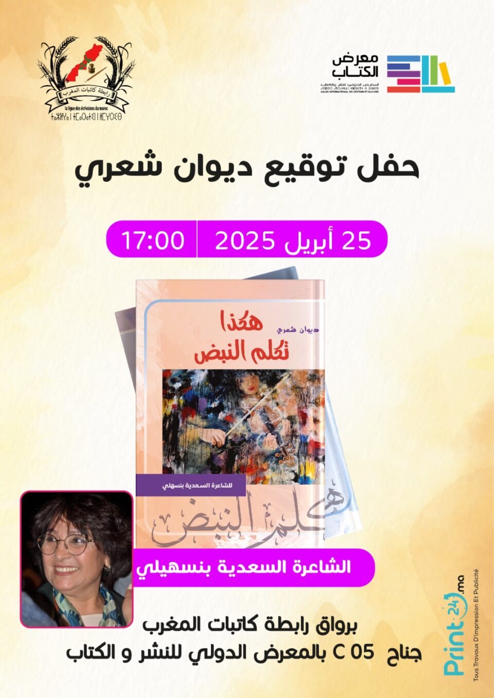 تستعد الشاعرة والأستاذة السعدية بنسهيلي يوم الجمعة 25 أبريل 2025، برواق رابطة كاتبات المغرب، جناح C05، لتوقيع ديوانها الشعري الأول “هكذا تكلم النبض”، وذلك ضمن فعاليات المعرض الدولي للنشر والكتاب في دورته الثلاثين.