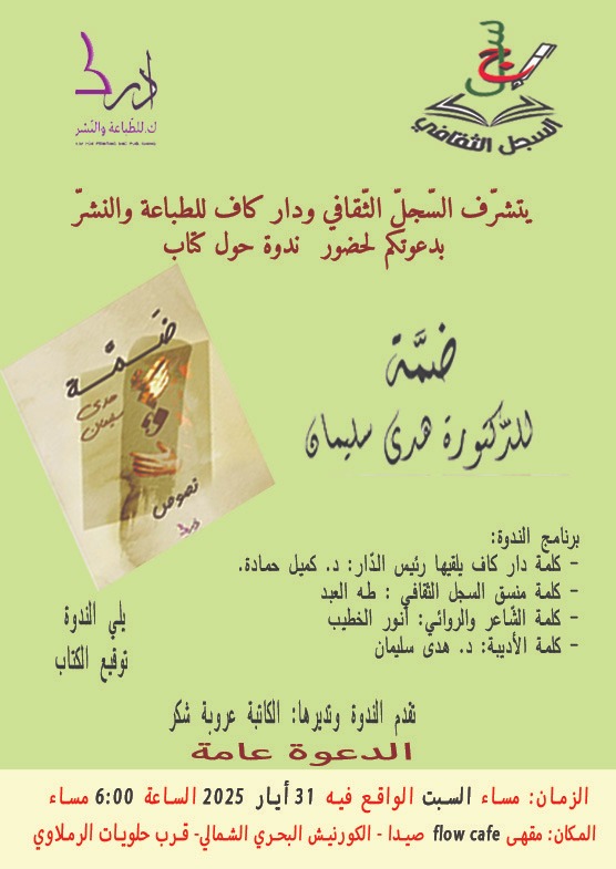 في إطار فعالياته الثقافية المتواصلة، سينظم السجل الثقافي ندوة أدبية مميزة سيحتضنها مقهى Flow الواقع على الكورنيش البحري الشمالي بمدينة صيدا في لبنان، مساء السبت 31 ماي 2025.