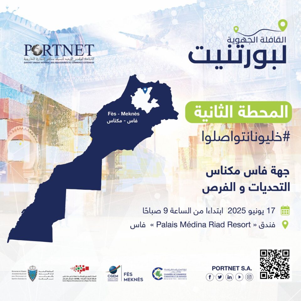 في إطار سعيها لتعزيز التحول الرقمي ودعم تنافسية المقاولات المغربية، أعلنت شركة PORTNET S.A عن مواصلة جولتها الجهوية، حيث تصل إلى محطتها الثانية في جهة فاس-مكناس، بعد النجاح الكبير الذي حققته في جهة الشرق.