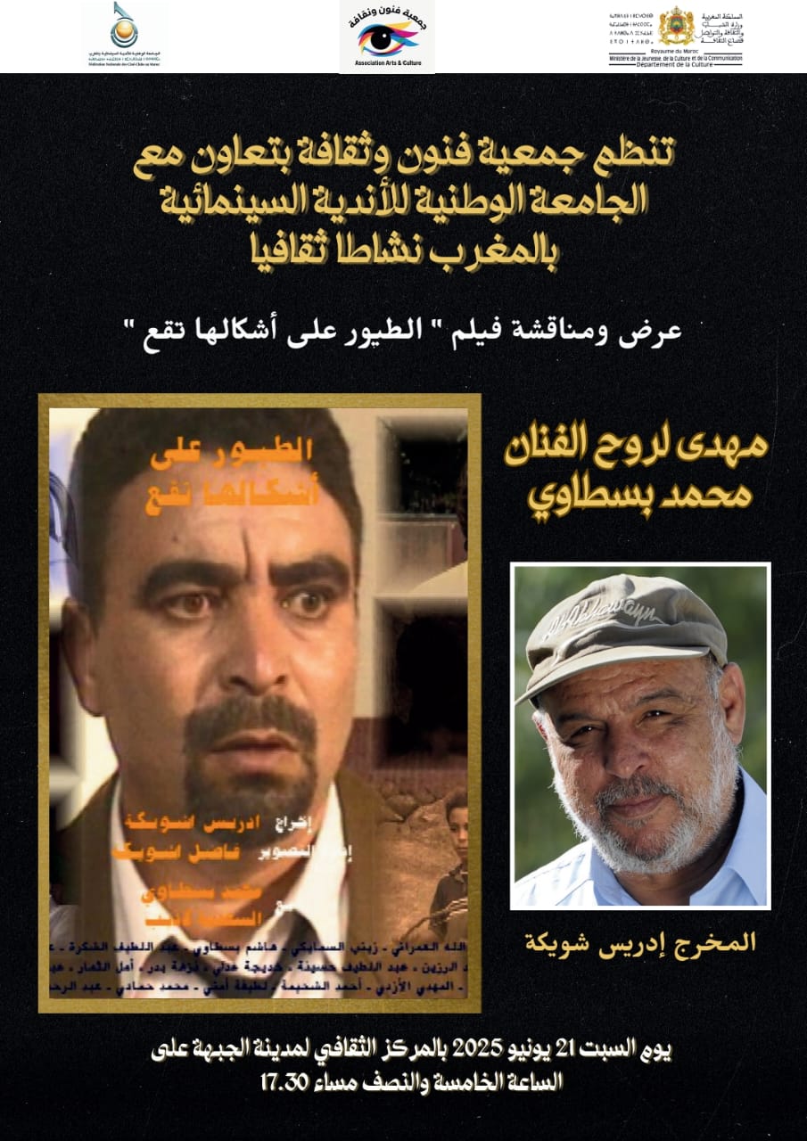 وفي بلاغ لها توصل موقع المستقبل24 بنسخة منه، كشفت الجامعة الوطنية للأندية السينمائية بالمغرب أنه يرتقب خلال هذا الموعد الفني عرض ومناقشة الفيلم التلفزيوني “الطيور على أشكالها تقع”، بحضور مخرج الفيلم، في التفاتة وفاء لروح الفنان الراحل محمد بسطاوي، الذي كان لهذا العمل أثر حاسم في مسيرته الفنية.