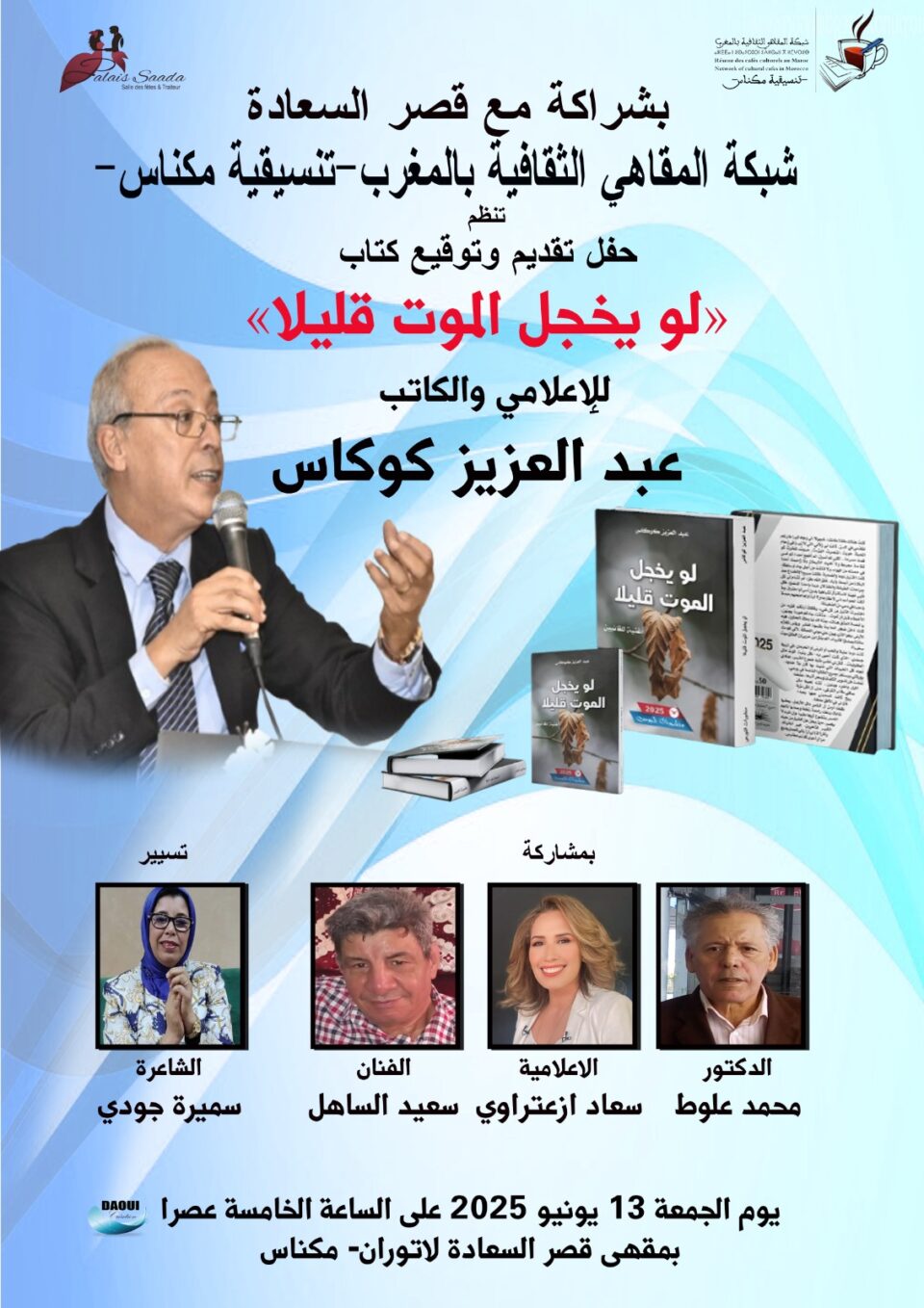 في إطار أنشطتها الثقافية والإشعاعية المستمرة، أعلنت شبكة المقاهي الثقافية بالمغرب – تنسيقية مكناس – عن تنظيم لقاء ثقافي يوم الجمعة 13 يونيو 2025، بمقهى قصر السعادة بمدينة مكناس، ابتداء من الساعة الخامسة عصرا، لتقديم وتوقيع كتاب “لو يخجل الموت قليلاً” للإعلامي والكاتب عبد العزيز كوكاس.