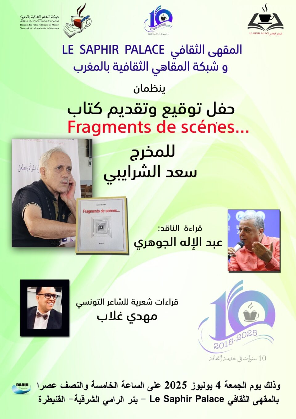 اللقاء، الذي ينطلق ابتداء من الساعة الخامسة والنصف مساء بمقهى “Le Saphir Palace” بحي بئر الرامي، سيعرف تقديم وتوقيع أحدث إصدارات الشرايبي بعنوان Fragments de scènes…، وهو كتاب يوثق لمحطات وتجارب فنية من مساره السينمائي الغني.