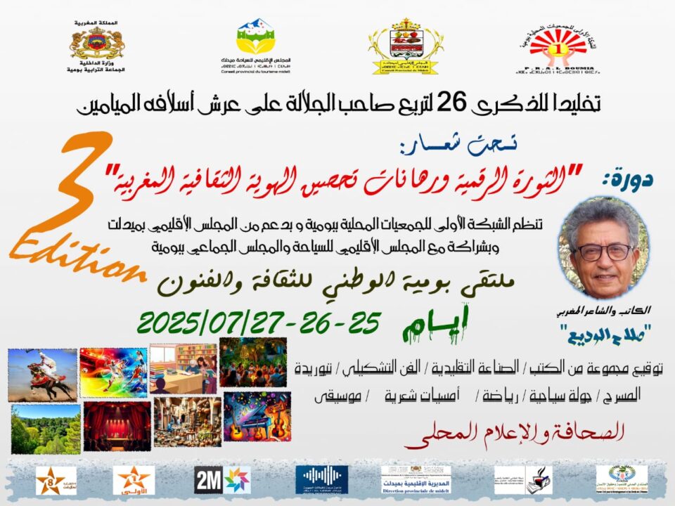 تخليدا للذكرى السادسة والعشرين لعيد العرش المجيد، تحتضن مدينة بومية فعاليات النسخة الخامسة من ملتقى بومية للثقافة والفنون، الذي تنظمه الشبكة الأولى للجمعيات المحلية في الفترة ما بين 24 و27 يوليوز 2025، تحت شعار: “الثورة الرقمية ورهانات تحصين الهوية الثقافية المغربية”.