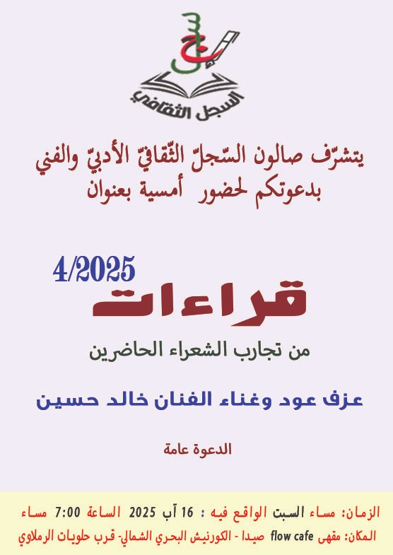 نظم صالون السجل الثقافي الأدبي والفني قراءات شعرية متميزة لشعراء محليين، ترافقها عزف وغناء للفنان خالد حسين، يوم السبت 16 غشت 2025، بمقهى Flow على الكورنيش البحري الشمالي في صيدا بلبنان.