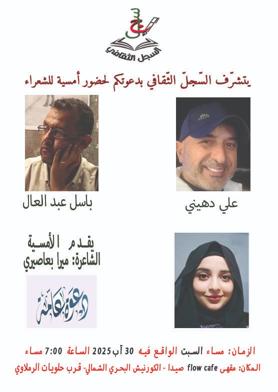 يواصل السجل الثقافي بلبنان برامجه الإبداعية من خلال تنظيم أمسية شعرية بمدينة صيدا، يشارك فيها الشاعران علي دهيني وباسل عبد العال، وتدير فقراتها الشاعرة ميرا بعاصيري. وسيحتضن مقهى Flow بالكورنيش البحري الشمالي، هذه الفعالية الثقافية مساء السبت 30 غشت 2025 ابتداءً من الساعة الخامسة.