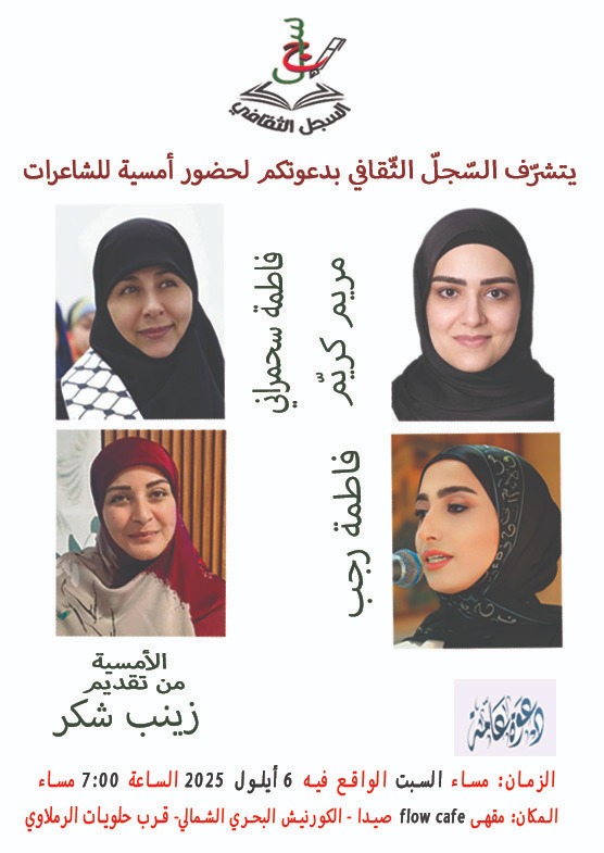 يواصل السجل الثقافي في لبنان أنشطته الإبداعية من خلال تنظيم أمسية شعرية جديدة تحتضنها فضاءات مقهى Flow بمدينة صيدا، يوم السبت 6 شتنبر 2025 ابتداء من الساعة الخامسة مساء.