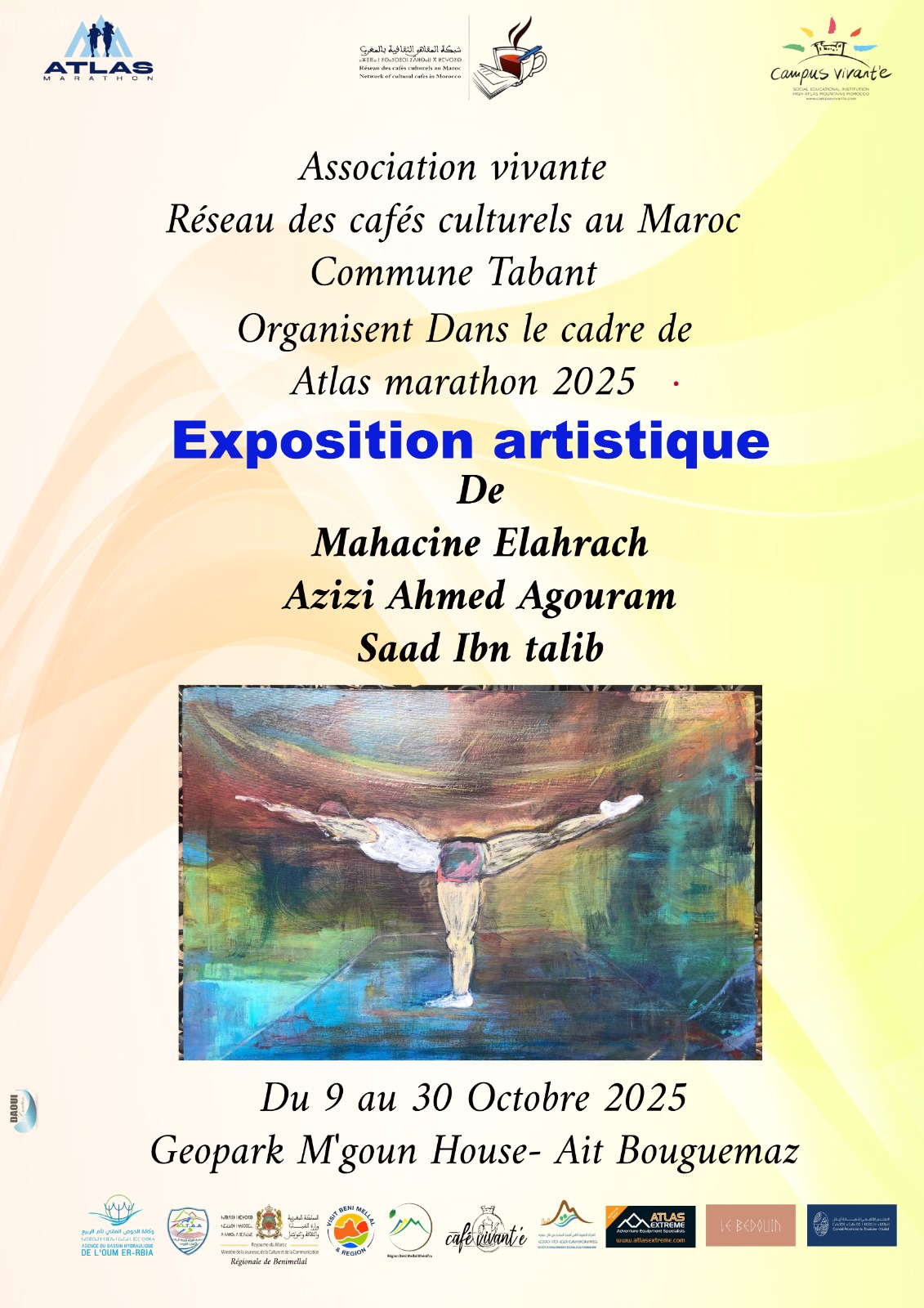 وفي سياق مواز، وتحت لواء “أطلس ماراطون 2025”، تنظم الجمعية الحية وشبكة المقاهي الثقافية وجماعة تبانت بإقليم أزيلال، بشراكة مع عدد من الفاعلين الثقافيين، معرضا فنيا تشكيليا بمشاركة الفنانين محاسن الأطرش، عزيزي أحمد أكورام، وسعد ابن طالب. ويستمر المعرض من 9 إلى 30 أكتوبر 2025 بدار جيوبارك مكون بأيت بوكماز، في مبادرة تسعى إلى ربط الفن التشكيلي بجغرافيا المكان وإبراز غنى الموروث الثقافي والطبيعي للمنطقة.