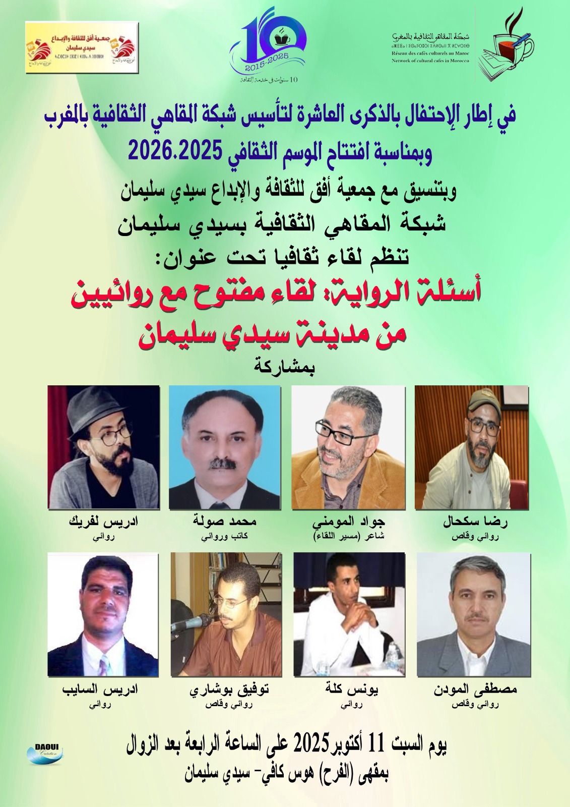 وبمناسبة افتتاح الموسم الثقافي 2025-2026، وبشراكة مع جمعية أفق للثقافة والإبداع بسيدي سليمان، تفتتح شبكة المقاهي الثقافية تجربتها الأولى بالمدينة من خلال لقاء ثقافي يحمل عنوان “أسئلة الرواية: لقاء مفتوح مع روائيين من مدينة سيدي سليمان”، بمشاركة ثلة من المبدعين المحليين، من بينهم رضا سكحال، جواد المومني، محمد صولة، إدريس لفريك، مصطفى المودن، يونس كلة، توفيق بوشاري، وإدريس السايب. ويقام هذا اللقاء يوم السبت 11 أكتوبر 2025 على الساعة الرابعة بعد الزوال بمقهى “الفرح” (هوس كافي) بمدينة سيدي سليمان، في أجواء من الحوار والتبادل الثقافي بين الكتاب والجمهور.