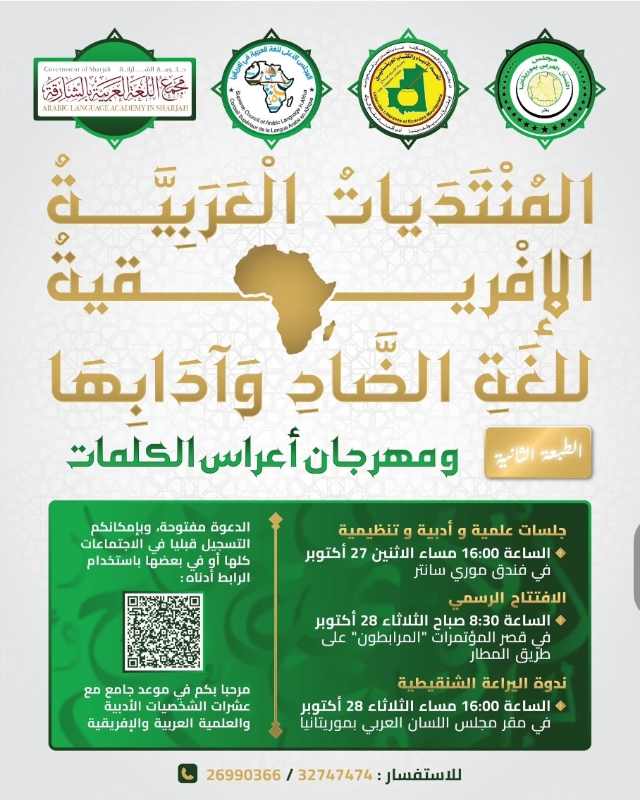 وينظم هذا الحدث العلمي الكبير بشراكة بين مجمع اللغة العربية بالشارقة، ومجلس اللسان العربي في موريتانيا، واتحاد الأدباء والكتاب الموريتانيين، والمعهد الثقافي الأفريقي العربي في باماكو، إلى جانب مؤسسات إفريقية وعربية تعنى بالنهوض باللغة العربية، وذلك خلال الفترة الممتدة من 27 إلى 29 أكتوبر الجاري، تحت الرئاسة السامية لفخامة الرئيس الموريتاني محمد بن الشيخ الغزواني.