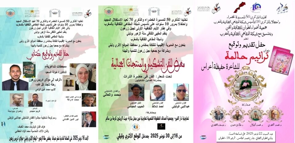 كما سيعرف مقهى “Corbeille Fleurie” توقيع كتابي “محطات شاعرية” للدكتورة خولة السعيد، و”الركب إلى مولاي إدريس زرهون، رحلة تتجدد كل عام” للأديب محمد أمين الرتمي، بمشاركة الكاتب والناقد محمد إدارغة، إلى جانب قراءات شعرية لكل من الشاعرين كريم مجيدو ورضوان بوودينة. وستتخلل هذه الفعاليات فقرة فنية تجمع بين التشكيل والموسيقى، من خلال رسم حي للفنان عبد النبي الوكيلي، يصاحبه عزف على الوثار للفنان محمد النفنيف، وعلى الآلات النحاسية للفنان محمد فؤاد الخطابي، وذلك بالموقع الأثري وليلي.