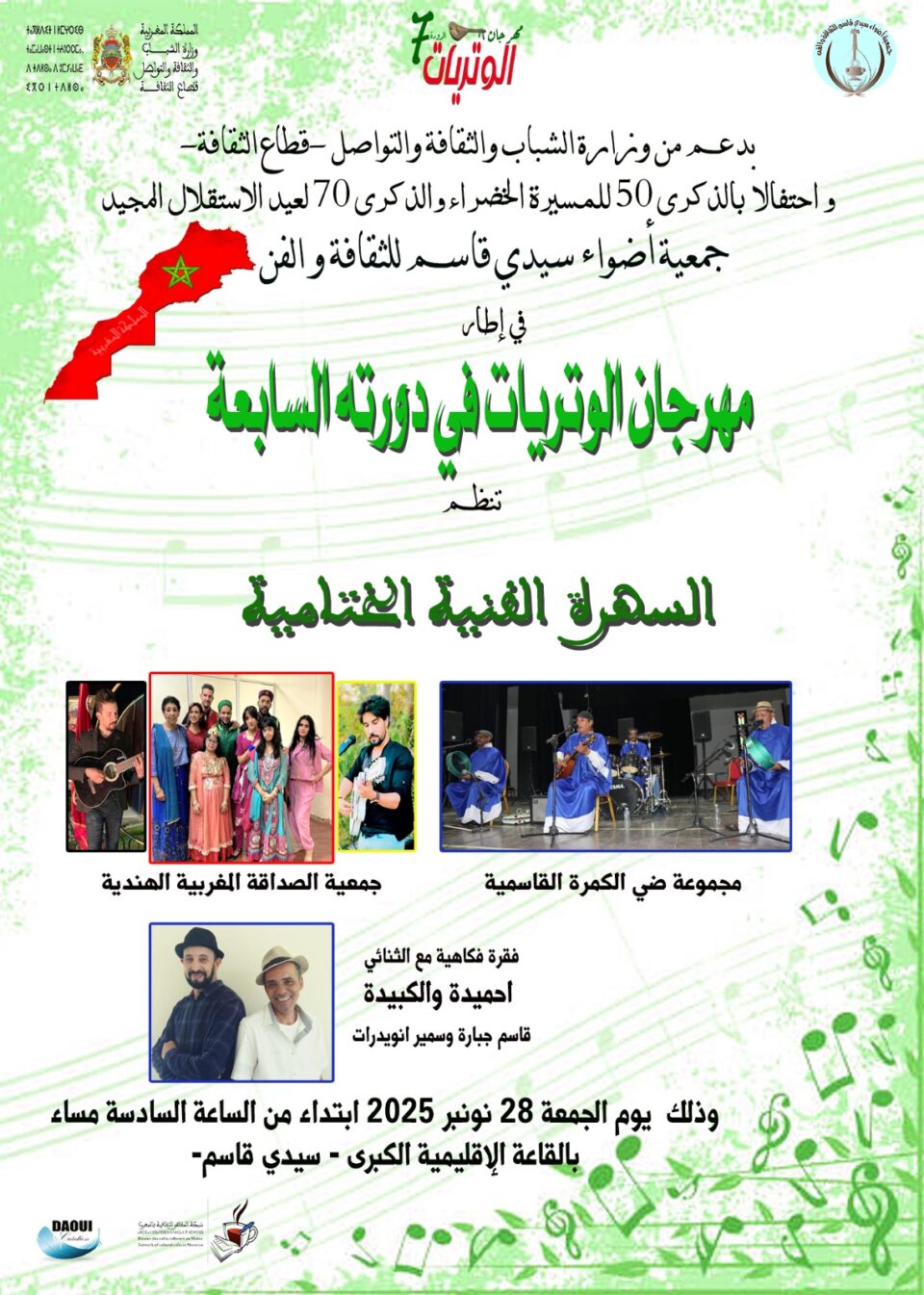 تعيش مدينة سيدي قاسم خلال الفترة ما بين 27 و29 نونبر 2025 على إيقاع فعاليات الدورة السابعة من مهرجان الوتريات، الذي تنظمه جمعية أضواء سيدي قاسم للثقافة والفن بدعم من وزارة الشباب والثقافة والتواصل، تحت شعار “الموسيقى المغربية.. الوحدة في التنوع”.