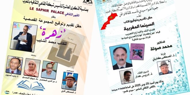 وفي محطة ثانية، تعرف مدينة سيدي قاسم يوم السبت 29 نونبر 2025 تنظيم لقاء ثقافي بالمقهى الثقافي “لسامير”، يتم خلاله تقديم و توقيع كتاب “السينما المغربية… قضايا النقد والإبداع والتجريب: فيلم جوع كلبك لهشام العسري نموذجا” في قراءة سوسيو-ثقافية للدكتور محمد صولة، وذلك ابتداء من الساعة الحادية عشرة صباحا.