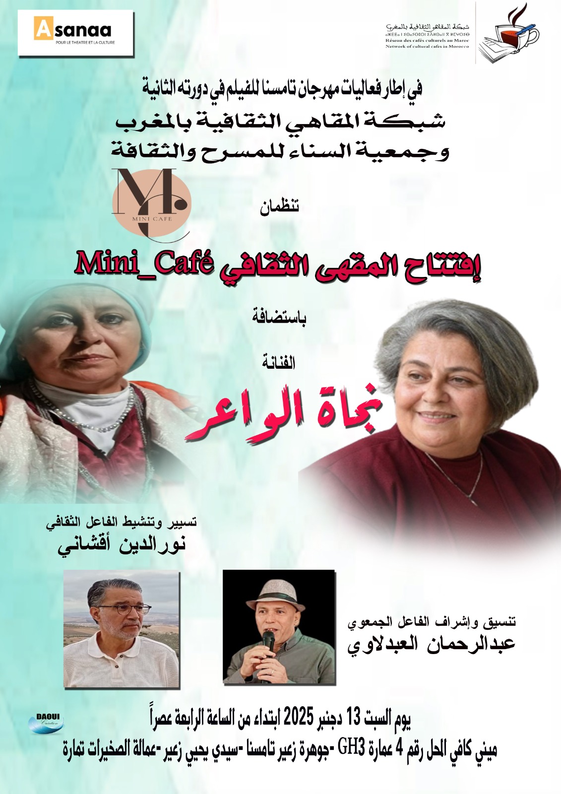 وفي سياق تعزيز المبادرات الثقافية بالمنطقة، تعلن الجمعية المنظمة، وبتنسيق مع شبكة المقاهي الثقافية بالمغرب، عن افتتاح مقهى ثقافي جديد يحتضنه Mini Café بجوهرة زعير GH3 بتمارة–تامسنا، وذلك يوم السبت 13 دجنبر 2025 ابتداء من الساعة الرابعة عصرا. وستتم استضافة الفنانة نجاة الواعر في هذا الافتتاح، بتنسيق الفاعل الجمعوي عبد الرحمان العبدلاوي وتنشيط الفاعل الثقافي نور الدين أقشاني.