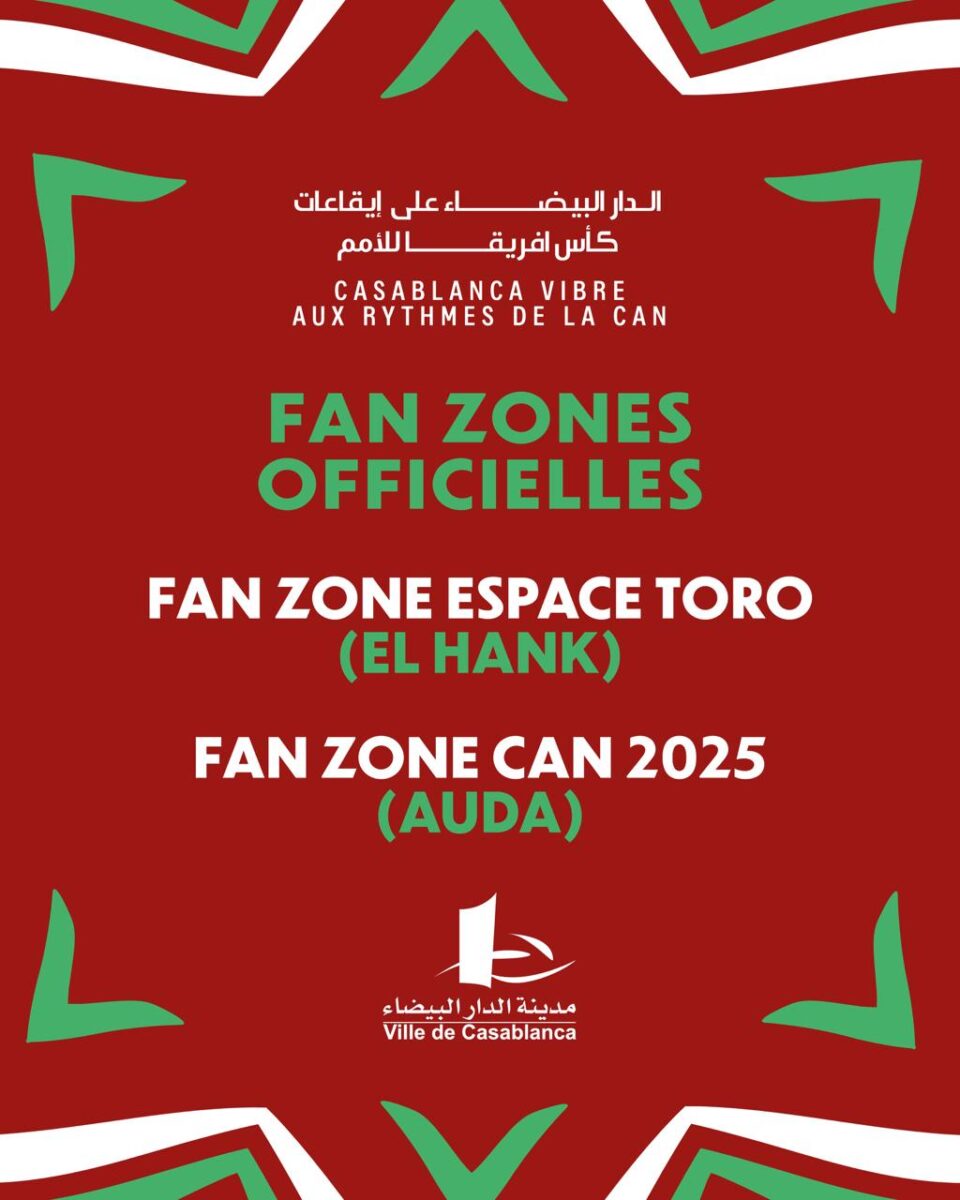 كما تم تجهيز، يقول البلاغ، أربع مناطق مجانية مفتوحة لجميع الزوار، تقع في أماكن قريبة ورمزية، تشمل: “حديقة جامعة الدول العربية”، و”حديقة سطاتة”، و”فضاء زلقاء”، إضافة إلى قرية “Route de la CAN” على شارع الراشدي، المخصصة لمتابعة المباريات والأنشطة الثقافية الإفريقية. إلى جانب ذلك، تم تخصيص بعض مناطق المشجعين الخاصة لتعزيز التجربة الجماهيرية.