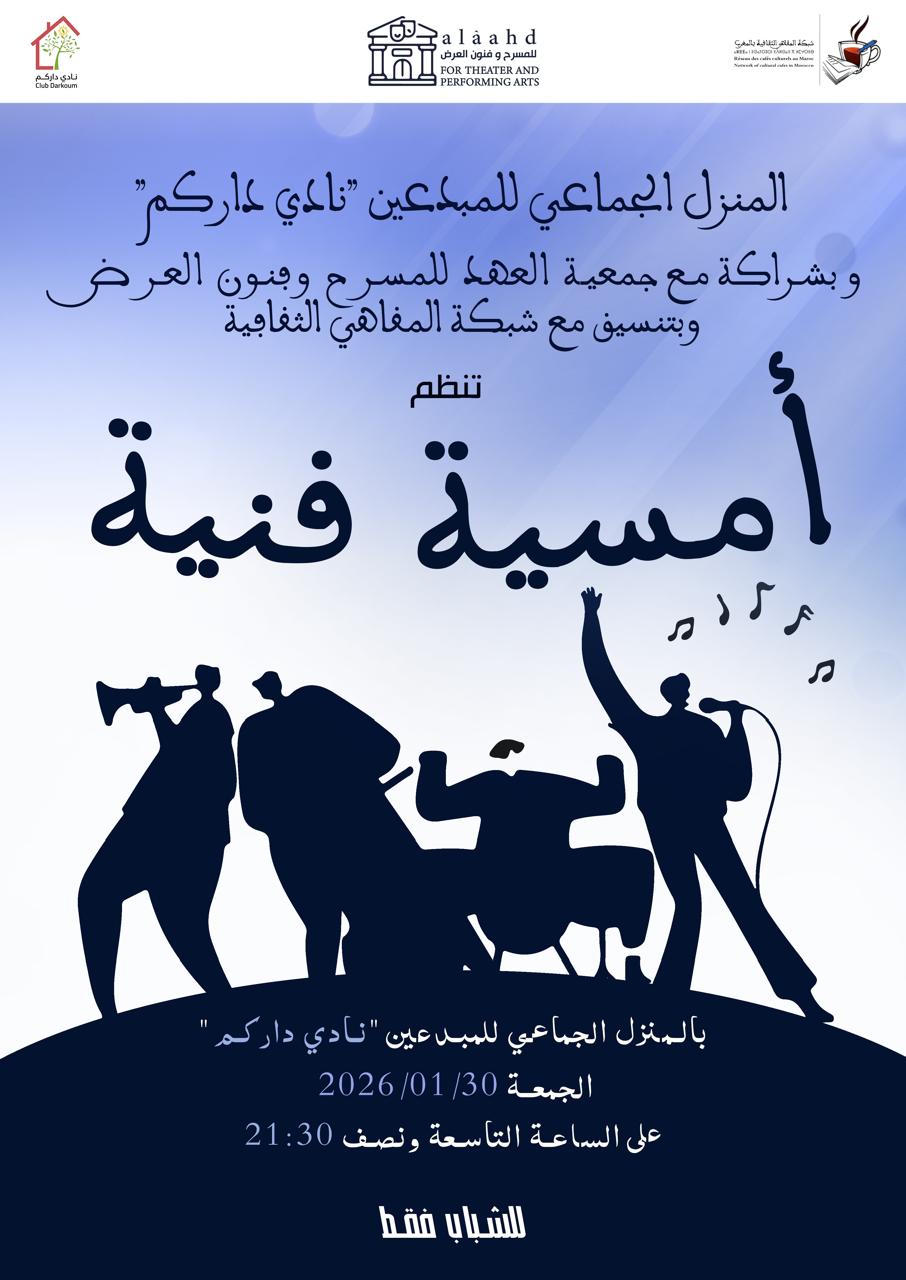 تحتضن مدينة قلعة السراغنة، مساء يوم الجمعة 30 يناير 2026، أمسية فنية موجهة للشباب، ينظمها المنزل الجماعي نادي داركم بشراكة مع جمعية العهد للمسرح وفنون العرض، وبتنسيق مع شبكة المقاهي الثقافية بالمغرب، وذلك في إطار دعم الحركية الثقافية وتشجيع التعبير الإبداعي لدى الشباب.