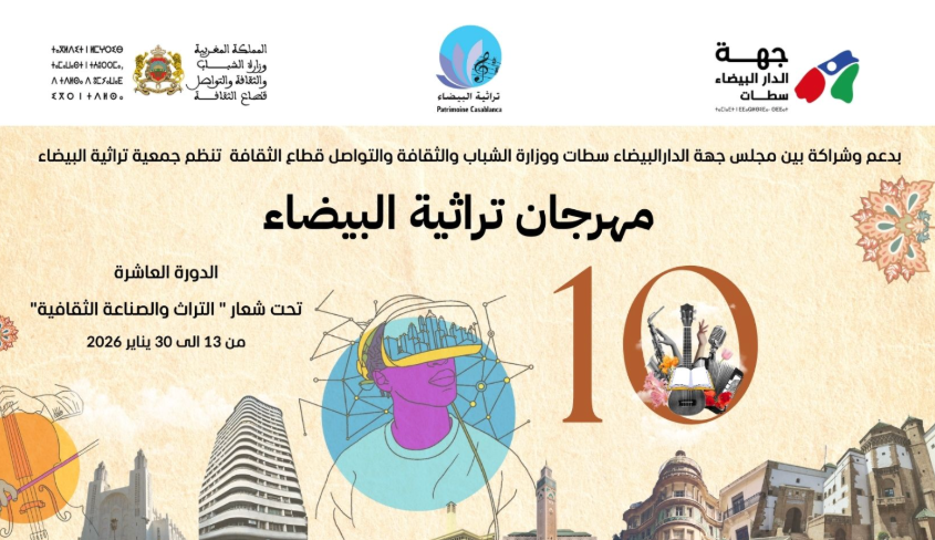 أسدلت جمعية تراثية البيضاء الستار على الدورة العاشرة من مهرجان تراثية البيضاء، من خلال حفل ختامي فني وتراثي يوم الجمعة 30 يناير 2026 بالمركب الثقافي مولاي رشيد بالدار البيضاء. وامتدت فعاليات المهرجان منذ 13 يناير الجاري، حيث تميزت هذه الدورة ببرنامج ثقافي متنوع شمل محاضرات علمية، دورات تكوينية، قوافل تربوية، ولقاءات توقيع كتب، مسلطًا الضوء على التراث المغربي والبيضاوي وارتباطه بالصناعة الثقافية.