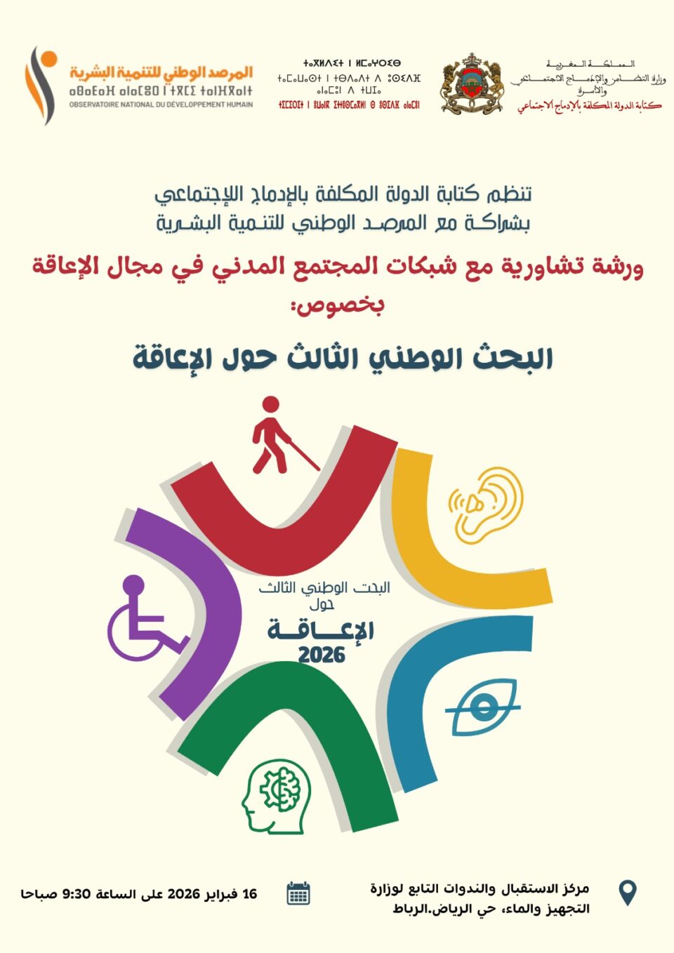 في إطار العناية الخاصة التي يوليها الملك محمد السادس للنهوض بحقوق الأشخاص في وضعية إعاقة، واستحضاراً لمبادئ الديمقراطية التشاركية في إعداد السياسات والبرامج العمومية، أعلنت كتابة الدولة المكلفة بالإدماج الاجتماعي، بتعاون مع المرصد الوطني للتنمية البشرية، عن تنظيم ورشة تشاورية مع شبكات الجمعيات العاملة في مجال الإعاقة، وذلك يوم الاثنين 16 فبراير 2026 بـمركز الاستقبال والندوات بحي الرياض في الرباط.