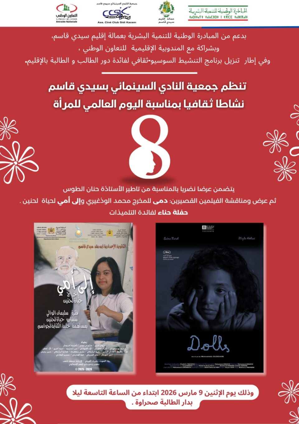 ويتضمن برنامج الأمسية عرضا نظريا حول دلالات اليوم العالمي للمرأة من تأطير الأستاذة حنان الطوس، إلى جانب عرض ومناقشة فيلمين قصيرين يسلطان الضوء على قضايا إنسانية واجتماعية، وهما فيلم “دمى” للمخرج محمد الودغيري، وفيلم “إلى أمي” للمخرجة حياة لحنين.