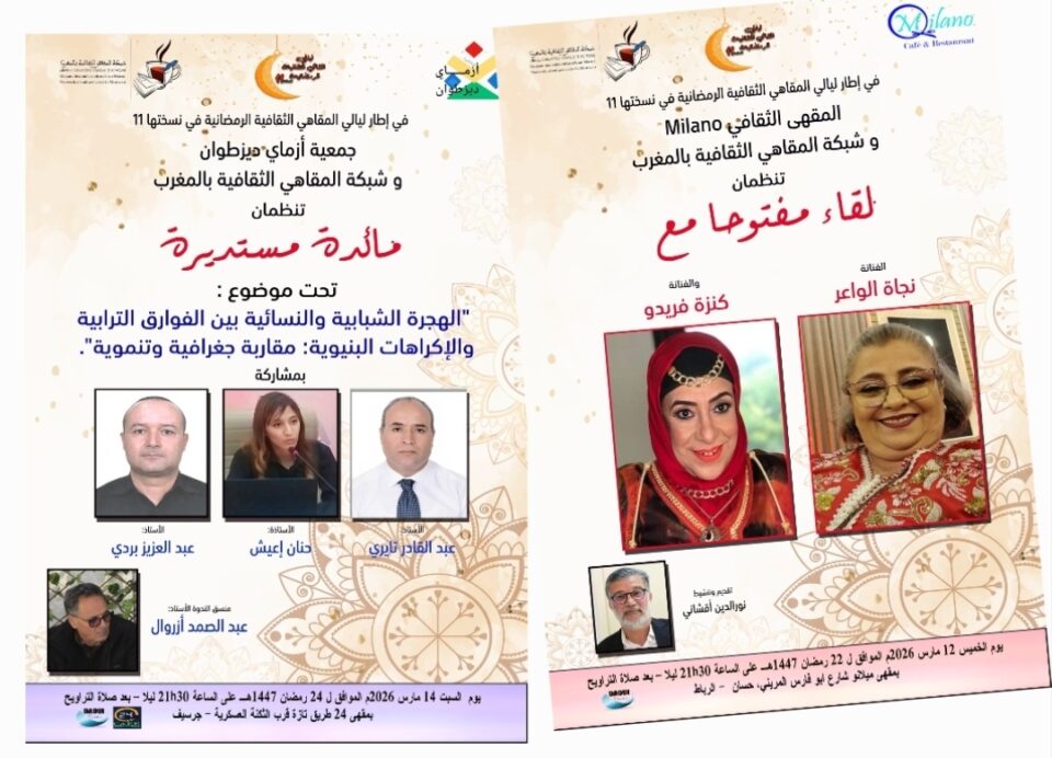وفي إطار توسيع دائرة النقاش الثقافي والاجتماعي، تنظم الشبكة، بتنسيق مع جمعية “أزماي ديزطوان”، مائدة مستديرة بمدينة جرسيف تحت عنوان “الهجرة الشبابية والنسائية بين الفوارق الترابية والإكراهات البنيوية: مقاربة جغرافية وتنموية”، وذلك يوم السبت 14 مارس 2026 الموافق لـ24 رمضان 1447، بمقهى 24 الكائن بطريق تازة قرب الثكنة العسكرية.