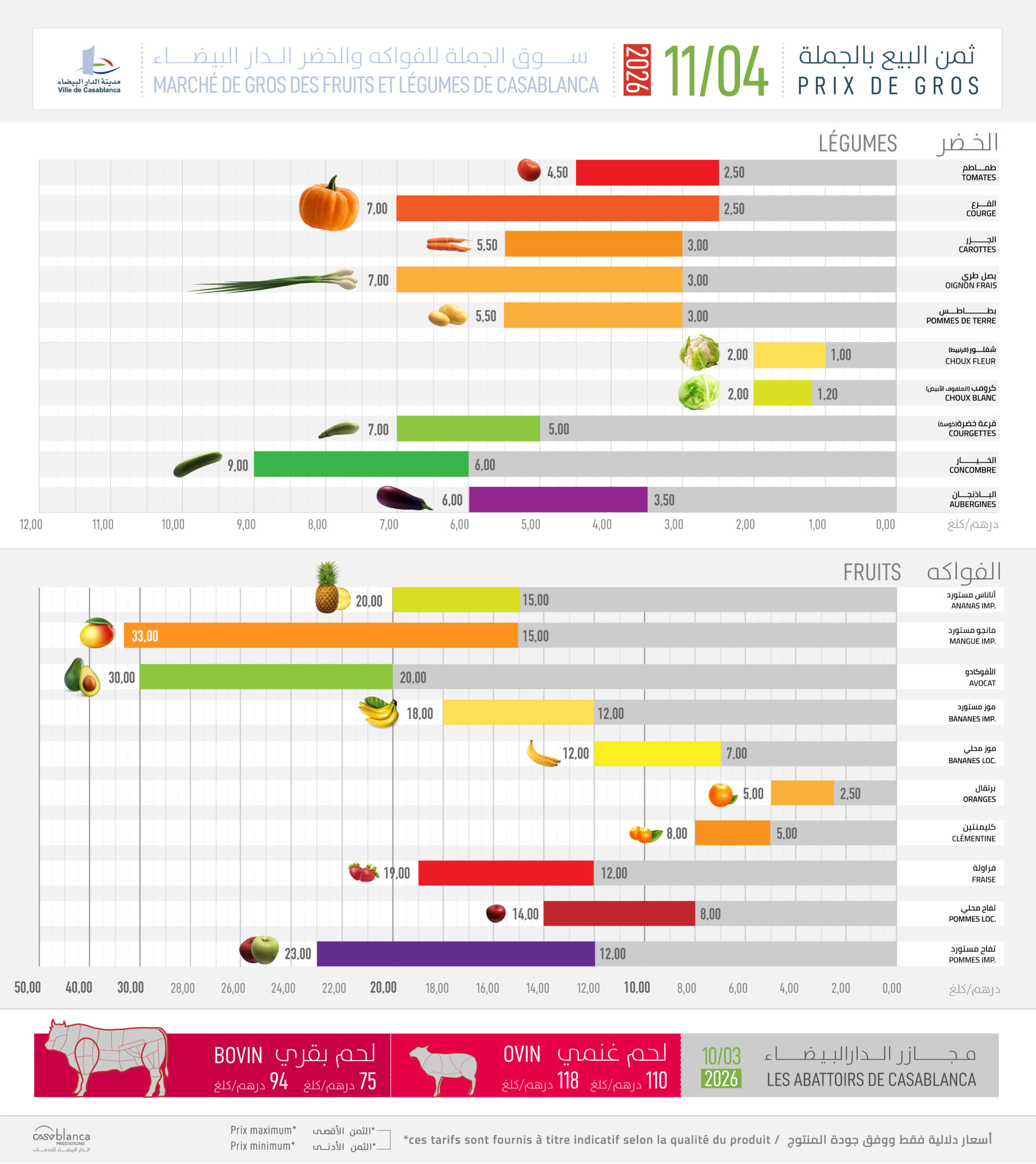 أعلنت جماعة الدار البيضاء عن المنشور الأسبوعي لأثمنة الفواكه والخضر واللحوم الحمراء، حيث تم تحديد الأسعار الأدنى والأقصى للبيع بالجملة في المدينة.