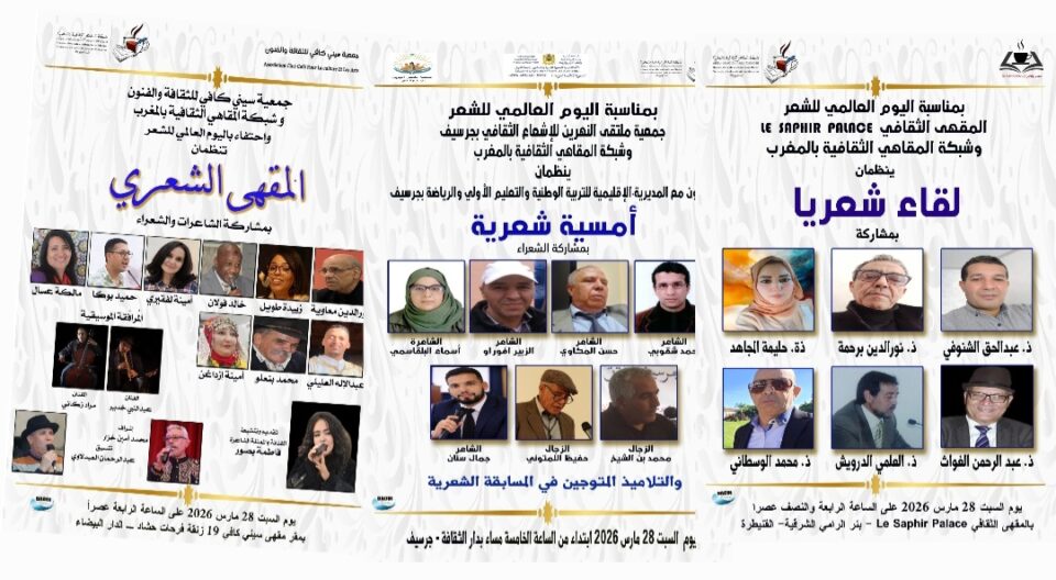 تستعد شبكة المقاهي الثقافية بالمغرب لتخليد اليوم العالمي للشعر من خلال تنظيم احتفالية شعرية وطنية يوم السبت 28 مارس 2026، بكل من الدار البيضاء وجرسيف والقنيطرة، في مبادرة ثقافية تروم تعزيز حضور الشعر في الفضاءات العمومية وتقريب الإبداع الأدبي من الجمهور الواسع، وترسيخ دور المقاهي الثقافية في تنشيط المشهد الثقافي المغربي وإحياء الحركة الشعرية بمشاركة عدد من الشعراء والفنانين والفعاليات الثقافية والجمعوية والإعلامية.