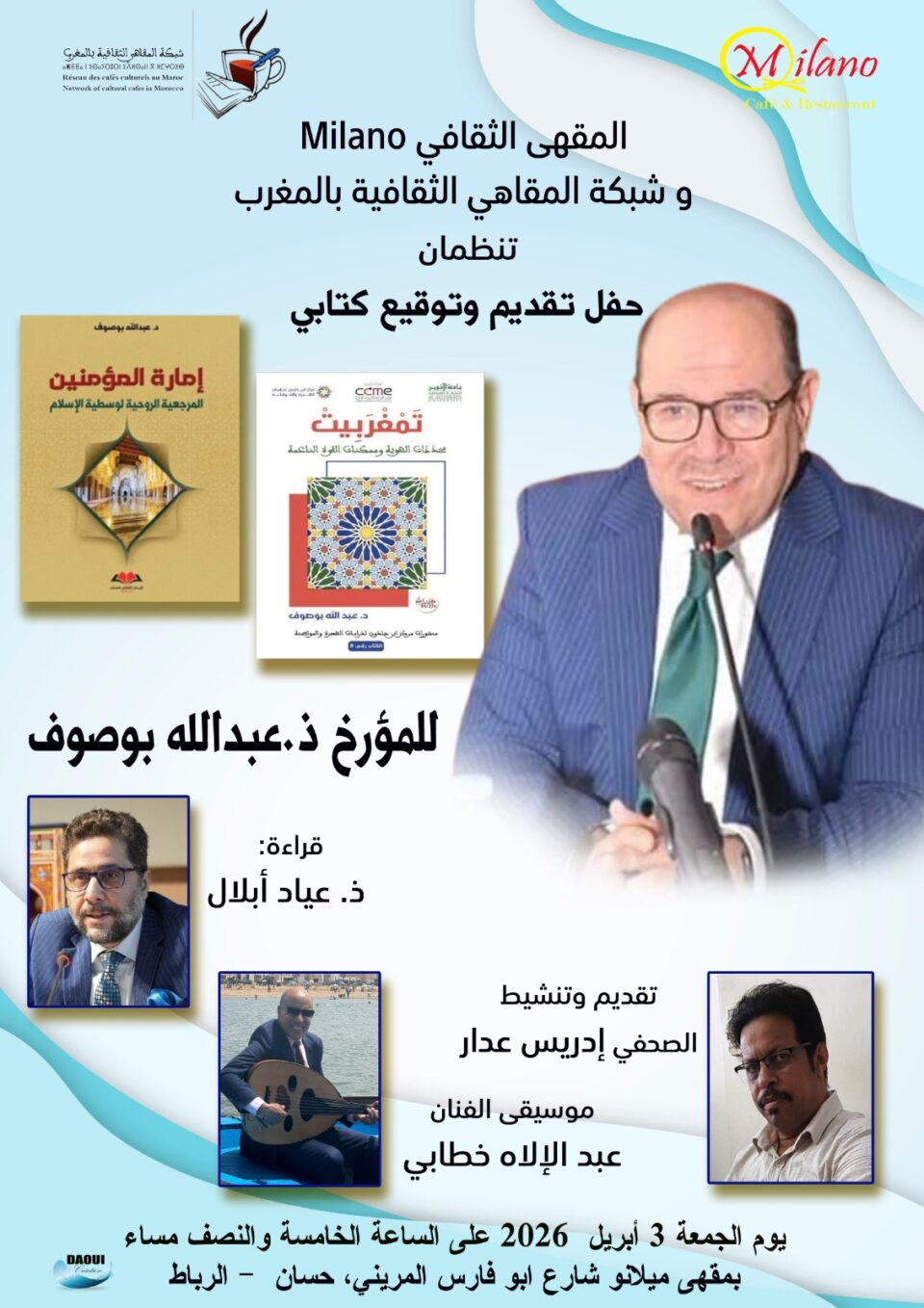 في إطار تعزيز الأنشطة الثقافية والإشعاعية لشبكة المقاهي الثقافية بالمغرب، أعلنت الشبكة عن تنظيم حفل تقديم وتوقيع كتابي المؤرخ عبد الله بوصوف يوم الجمعة 3 أبريل 2026 بمقهى Milano الواقع بشارع أبو فارس المريني حسان في مدينة الرباط، ابتداءً من الساعة الخامسة والنصف مساء.