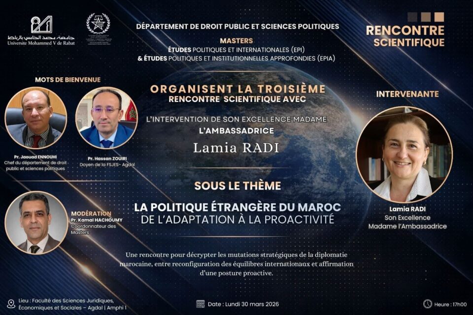 تحتضن كلية العلوم القانونية والاقتصادية والاجتماعية أكدال التابعة لجامعة محمد الخامس بالرباط، مساء يوم الاثنين 30 مارس 2026، لقاء علميا لمناقشة تحولات السياسة الخارجية للمغرب في ظل المتغيرات الجيوسياسية الدولية، وذلك في إطار الأنشطة الأكاديمية لماستر الدراسات السياسية والدولية وماستر الدراسات السياسية والمؤسساتية المعمقة.