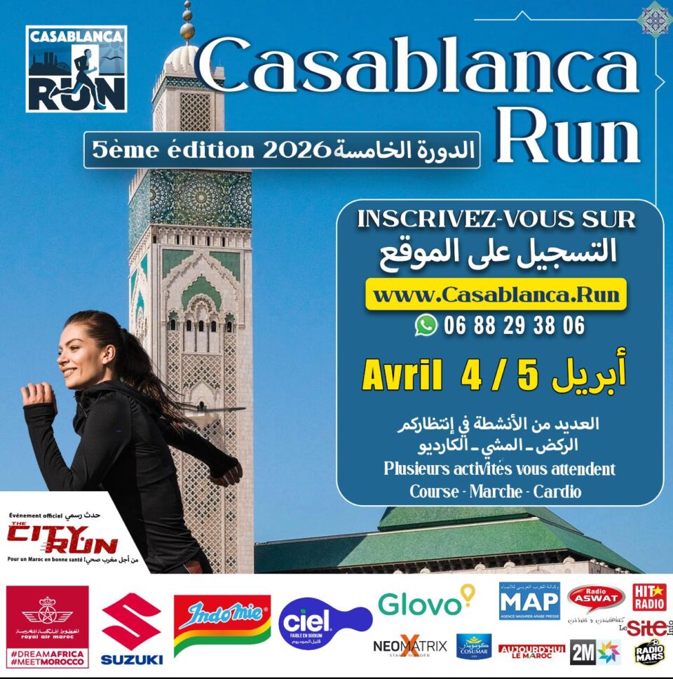 تستعد مدينة الدار البيضاء لاحتضان الدورة الخامسة من تظاهرة “CasablancaRun”، التي تنظمها جمعية TheCity Run يومي السبت 4 والأحد 5 أبريل 2026، بالممشى البحري لمسجد الحسن الثاني، في حدث رياضي حضري يهدف إلى تشجيع ممارسة الرياضة وتعزيز ثقافة الجري والمشي داخل الفضاءات العامة.