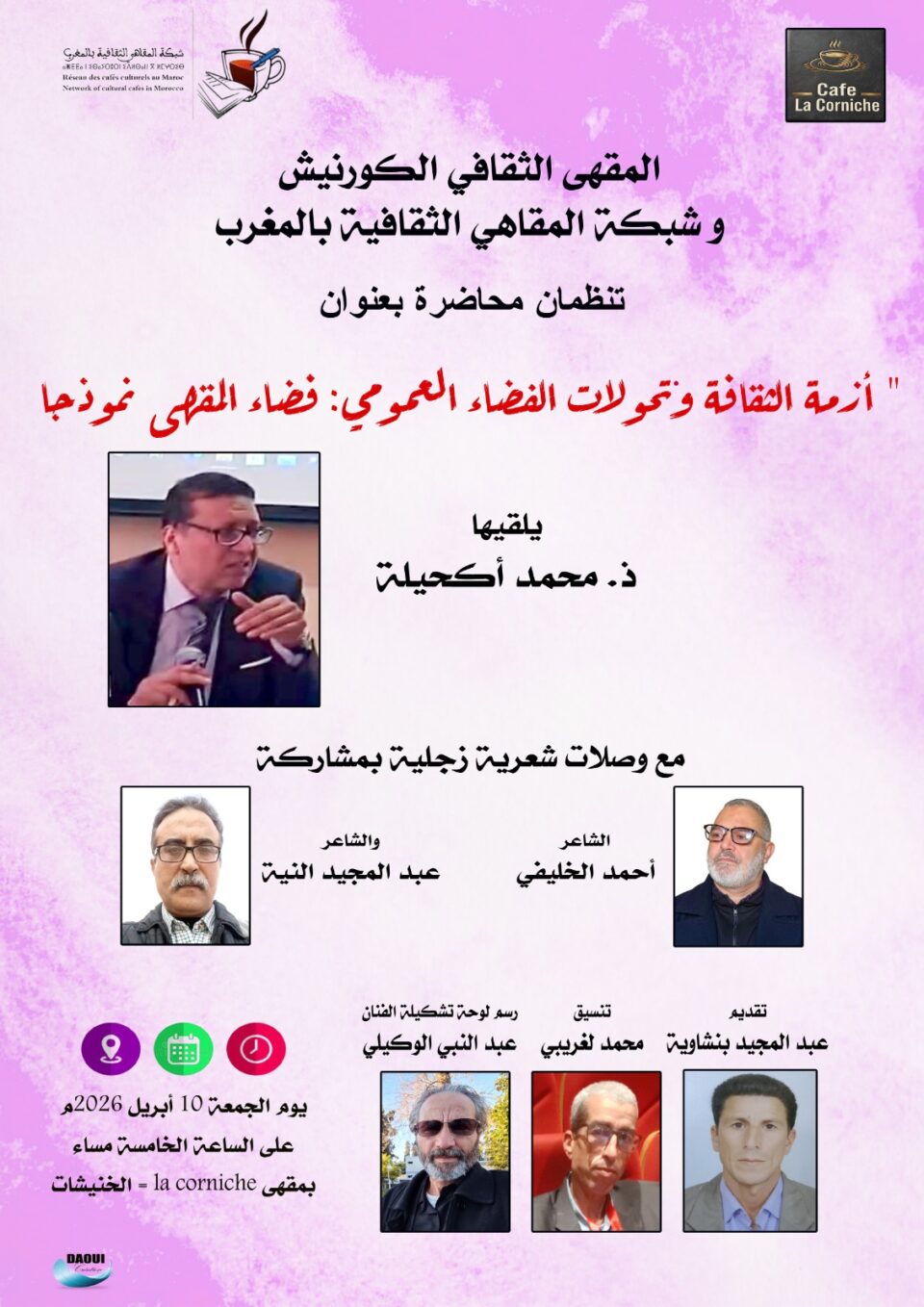 وأفادت شبكة المقاهي الثقافية بالمغرب أن هذا اللقاء سيشهد إلقاء محاضرة بعنوان “أزمة الثقافة وتحولات الفضاء العمومي: فضاء المقهى نموذجا”، يقدمها الأستاذ محمد أكحيلة، حيث سيتناول من خلالها التحولات التي يعرفها الفضاء الثقافي العمومي ودور المقاهي الثقافية في إعادة إحياء النقاش الفكري والثقافي داخل المجتمع. كما سيعرف اللقاء تقديم وصلات شعرية زجلية بمشاركة الشاعرين أحمد الخليفي وعبد المجيد النية، في إطار مزج الفكر بالإبداع الأدبي وإتاحة فضاء للتعبير الفني.