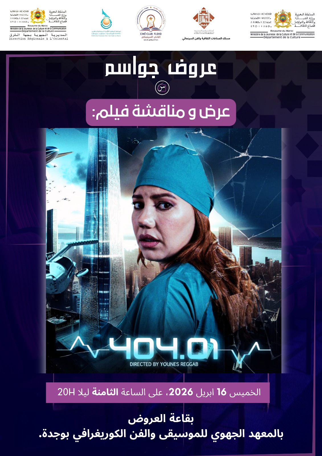 في هذا السياق، تحتضن مدينة وجدة، بتنسيق مع جمعية سيني مغرب، عرضًا ومناقشة لفيلم 404.01 للمخرج يونس الركاب، وذلك مساء الخميس 16 أبريل بقاعة العروض التابعة للمعهد الجهوي للفن الموسيقي والرقص الكوريغرافي. ويلي هذا العرض، يوم الجمعة 17 أبريل، لقاء فكري بكلية الآداب والعلوم الإنسانية بجامعة محمد الأول، يخصص لمناقشة تجربة المخرج، بإشراف مسلك الصناعات الثقافية والفن السينمائي، في خطوة تروم تعميق النقاش الأكاديمي حول الإبداع السينمائي المغربي.