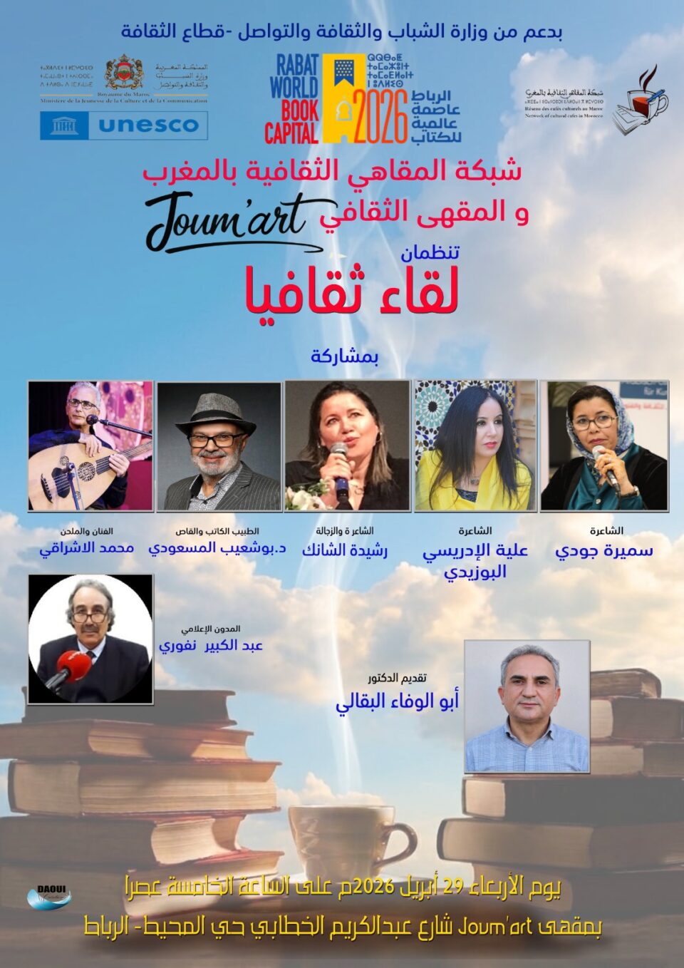وفي هذا الإطار، تحتضن العاصمة الرباط، يوم الأربعاء 29 أبريل 2026، لقاءً ثقافياً بمقهى “Joum’ art”، بمشاركة ثلة من الأسماء الأدبية والفنية. ويتعلق الأمر بكل من الطبيب والكاتب بوشعيب المسعودي القادم من خريبكة، والشاعرات سميرة جودي من مكناس، وعلية الإدريسي البوزيدي من الرباط، ورشيدة الشانك من القنيطرة، إلى جانب المطرب والملحن محمد الأشراقي من سلا.