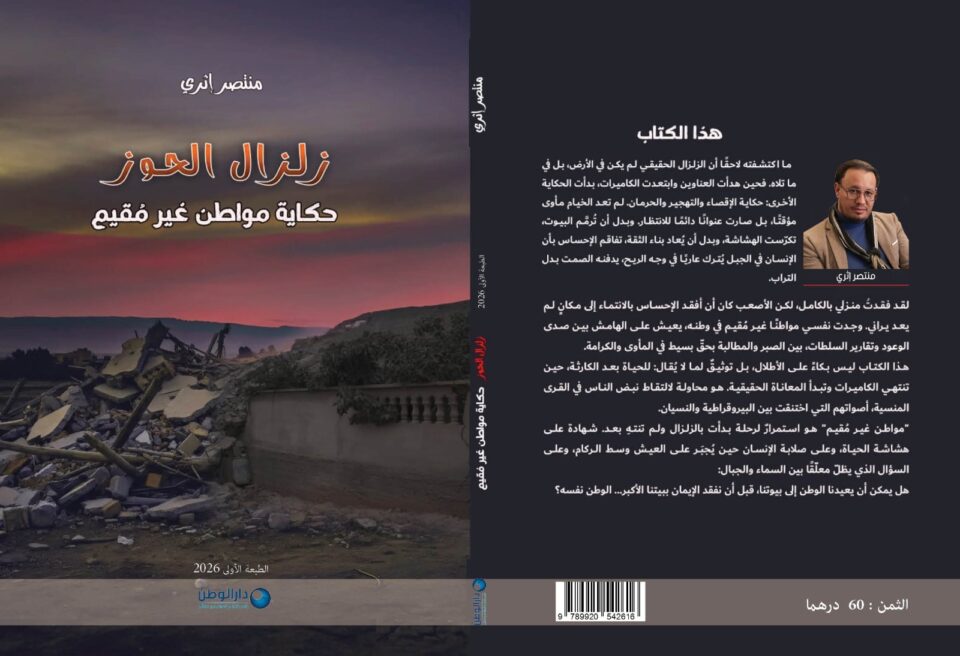 صدر عن “دار الوطن للصحافة والطباعة والنشر” كتاب جديد للكاتب والإعلامي منتصر إثري بعنوان “زلزال الحوز: حكاية مواطن غير مُقيم”، في 130 صفحة، يقدم من خلاله شهادة إنسانية وميدانية حول مرحلة ما بعد كارثة زلزال الحوز، مسلطًا الضوء على التحولات العميقة التي عرفتها أوضاع المتضررين بعد انحسار الاهتمام الإعلامي وتراجع موجة التضامن الأولية.