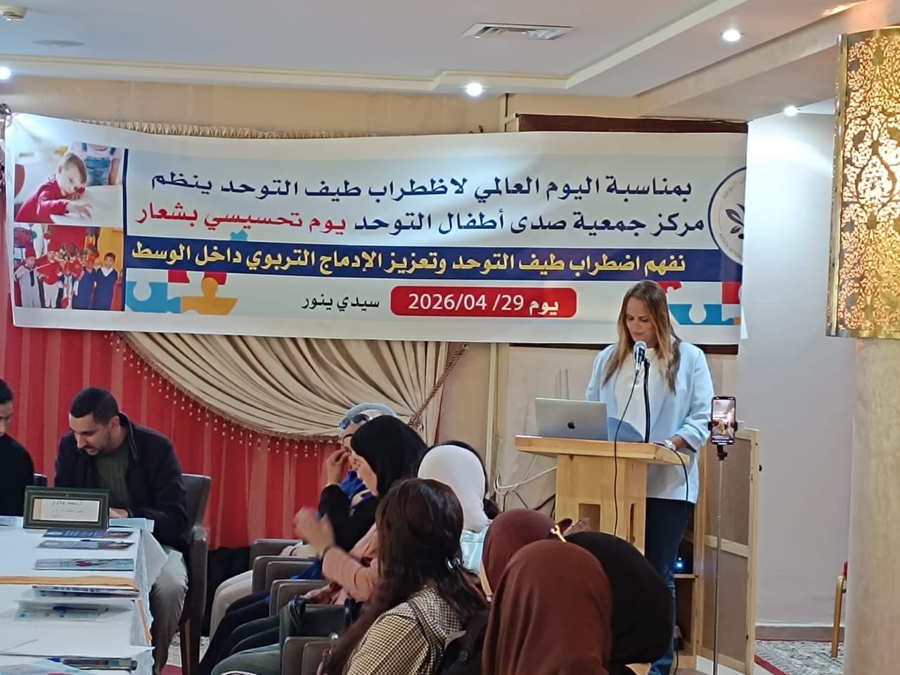 في سياق تخليد اليوم العالمي لاضطراب طيف التوحد، احتضنت مدينة سيدي بنور، يوم الأربعاء 27 أبريل 2026، لقاءً تحسيسياً سلط الضوء على قضايا إدماج الأطفال في وضعية توحد، في مبادرة نظمتها جمعية صدى أطفال التوحد بالجديدة بمشاركة فاعلين تربويين واجتماعيين، تحت شعار يركز على فهم اضطراب طيف التوحد وتعزيز الإدماج التربوي داخل الوسطين المدرسي والأسري.ويأتي تنظيم هذا اللقاء في ظل تنامي الاهتمام وطنياً ودولياً بقضايا الإعاقة، خاصة اضطراب طيف التوحد، باعتباره من التحديات التي تفرض اعتماد مقاربات شمولية ومندمجة، تضمن الحق في التعليم وتكافؤ الفرص للأطفال في وضعية إعاقة، بما يتماشى مع مبادئ التعليم الدامج. وقد شكل الحدث مناسبة لتلاقي ممثلي المجتمع المدني، والأطر التربوية، والأخصائيين النفسيين والاجتماعيين، إلى جانب أولياء الأمور، من أجل تبادل التجارب والخبرات ومناقشة سبل تطوير آليات الإدماج داخل المنظومة التربوية.